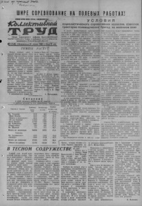 26 апреля 1959 года, № 51 КОЛЛЕКТИВНЫЙ ТРУД ЛI Я ТЕХ, П О РЕШАЕТ ЕУД.ЬБТ ТРОША» С лекциями—на полевые станы Интересная Сейчас, когда труженики полей начали напряженную борьбу за хлеб, от работников идеологического фронта и прежде всего от лекторов требуется, чтобы они были вместе с народом, в его гуще, непосредственно на производственных участках. Правильно поступили в Благодатской сельской лекторской группе. Здесь план лекционной работы на период весеннего сева был обсужден совместно с партийной организацией еще до начала полевых работ, утверждена тематика и принят график чтения лекций. Каждый лектор сообщил, какую тему и к какому сроку разработает, а руководитель группы помог определить аудиторию, перед которой выступит лектор. Но далеко еще не везде лекторские группы строят свою работу в соответствии с требованиями дня. Михайловская сельская лекторская группа, руководит которой т. Сергиенко, до сих пор не имеет плана чтения лекций в бригадах, Не готовят лекции для чтения на полевых станах лекторы Еарасартовского и Хорошин- ского объединений. Плохо поставлена лекционная пропаганда в Шиловокурь- инской и Морозовской группах. В истекшее время этого года они почти не участвовали в лекционной работе, да и сейчас пока здесь ничего не сделано по разработке интересующих население тем. Труженики полей большой интерес проявляют к текущим событиям внутри страны и за рубежом, они хотят знать о достижениях передовиков промышленного и сельскохозяйственного производства.Удовлетворить эти запросы—долг сельских лекторов. Отних требуется сейчас организовать так хлежиXXI глуработу, чтобы в каждой бригаде читалось в неделю не менее двух лекций, чтобы вся лекционная работа содействовала успешному проведению сева. Наши кукурузоводы решили нынче бороться не только за получение высоких урожаев зеленой массы, но и выращивание кукурузы на зерно. Помочь им в этом деле должны также лекторские группы. К выступлению по специальным вопросам надо широко привлекать специалистов, передовиков производства. Большие задачи перед боробами и работниками вотноводства поставил съезд КПСС. Разъяснять бочайшее содержание решений съезда, звать на их выполнение, содействовать в большом и в малом построению коммунистического общества —что может быть более почетного. Недостаточно внимания уделяют лекторские группы вопросам коммунистического воспитания, мало читается лекций для молодежи. Нерешительная борьба ведется с религией и всевозможными верованиями. Уважением всего прогрессивного человечества пользуется миролюбивая политика советской страны. Разъяснять ее содержание, разоблачать происки поджигателей войны, донести до сознания трудящихся непоколебимую веру в окончательную победу коммунизма, веру в торжество сил мира и социализма над силами войны—долг лекторов. Но при этом надо помнить, что результаты всей лекционной работы определяются трудовым подъемом, результатами работы. Д. Макашев, секретарь районного отделения Общества. программа Активное творческое соревнование началось сейчас в коллективах сельской художественной самодеятельности за подготовку наиболее интересной и содержательной программы, способной удовлетворить запросы хлеборобов, занятых на севе. Успешно идет подготовка в агитхудожествен- ных бригадах Хорошинского 