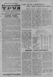 2 КОЛЛЕКТИВНЫЙ ТРУД 8 мая 1959 года, № 55 Агитаторы за работой Сейчас, когда хлеборобы приступили к закладке урожая первого года семилетки, от агитаторов требуется умение разъяснять материалы XXI съезда КПСС, душевным словом побуждать механизаторов и иолеводов к творческому труду на выполнение и перевыполнение сменных норм выработки с хорошим качеством. i Партийная организация колхоза им. Тельмана (секретарь партбюроМ. Васильев) в агитационной работе строго руководствуется задачами, исходящими из решений съезда. Агитаторы к делу здесь приступили с первым выходом тракторов в поле. Еще до начала полевых работ был пересмотрен состав агитколлектива. Вести агитационную работу в поле доверено наиболее опытным агитаторам: коммунистам, комсомольцам и беспартийным. В числе их старейшие агитаторы члены партии Марфа Герасименко, Антон Макотин, Степан Коломоец и другие. Здесь же и молодые агитаторы учителя Н. Д. Жа- ринова, Л. И. Москалева, А. К. Полянская. До начала полевых работ был утвержден план массово- политической работы среди колхозников, занятых в поле. При этом перед агитаторами поставлены требования, что вся их работа должна носить конкретный характер, способствовать мобилизации усилий тружеников полей на проведение сева зерновых за 8—10 дней при высоком качестве. Объем работ намечен немалый: посеять зерновых и технических культур на площади более 5 тыс. гектаров, в том числе 400 гектаров кукурузы на силос и зерно. Более половины всех земель предстояло заготовить весной. Многое уже сделано: более 98 процентов земель распахано, посеян рыжик и подсолнечник, влага закрыта за 4 дня, начался сев зерновых. Вторая бригада П. Д. Томило- ва держит первенство в социалистическом соревновании, и ей вручено переходящее знамя колхоза. Высокие образцы труда показывают члены этой бригады Алексей Никифоров, Илья Бондаренко, Василий Кулямпин. Они постоянно перевыполняют сменные нормы. Немалую роль в организации труда в бригадах сыграла массово-разъяснительная работа агитаторов. Они начали с того, что все вагончики оборудовали наглядной агитацией, ставящей задачу перед хлеборобами провести сев зерновых за 8—10 рабочих дней, все работы выполнить только качественно, ежесменно перевыполнять нормы выработки. В вагончиках поставили радиоприемники. Здесь же появились библиотечки-передвижки, шахматы, шашки, а на видном месте вывешены доски показателей. Предусмотрели выпуск стенных газет и «боевых листков», а также специального бюллетеня, из которого можно узнать выработку каждого тракториста за день и за пятидневку. Нынче, как и в предыдущие годы, заслуженной славой лучшего агитатора пользуется библиотекарь коммунист Марфа Григорьевна Герасименко. Нет того дня, чтобы она не побывала в бригаде с новой литературой, с интересной беседой, в которой обязательно учитывает результаты работы за день, отмечает передовиков, называет имена отстающих, Здесь же собирает материал для выпуска «Боевого листка». Неплохо работают и многие другие агитаторы: Тамара Ле- бедко, Александр Сидоренко. Местная сельская агитхудо- жественная бригада уже не один раз побывала в поле с концертами. Лекторы сельской группы общества выступают на полевых станах с лекциями и докладами. Все • это способствует проведению важнейшей кампании в самые лучшие агротехнические сроки. В. Де