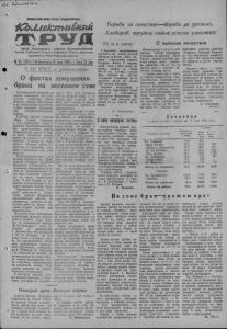 улалХгх s / ягояетарии всех стран, соединритесы 4C fc4J£ Jcrn u £ H6iU 'Г£>'2ГД орган Карасукского райкома Коммунистической партии Советского Союза и районного Совета депутатов трудящихся Новосибирской области №56 С25Ы) IjjpcHpecBHbB.IO мая 1959г. ЭЦенз 15 иоп. В РК КПСС и райисполкоме О фактах допущения брака на весеннем севе Произведенной проверкой на местах установлено, что в некоторых хозяйствах района качество полевых работ низкое и не соответствует агротехническим правилам возделывания сельскохозяйственных культур. Б шестой бригаде колхоза «Маяк Ильича» (бригадир т. Гук) трактористы Рудер и Дергилев производили вспашку без предплужников, лемехи пятикорпусных плугов и отвалы были отломлены, пахота велась на глубину 5— 10 сантиметров. В погоне за количеством гектаров полоса обработана со сплошными огрехами и непригодна для сева культур. Неудовлетворительно в этой бригаде ведется и сев. Трак- юристы посевных агрегатов Мельников и Толмачёв (а постоянными сеяльщиками агрегаты не укомплектованы) посев овса и пшеницы производят по плохо обработанной почве. В этой бригаде не проводятся протравливание и воздушно-тепловой обогрев семян. Председатель колхоза т.Го- релов, заместитель т. Хисма- тулин, агроном Жанжаксин агрономической работой не занимаются, контроль за качеством работ не ведут, тем самым создают условия для бракодельства. Не соответствует требованиям агротехники качество полевых работ в колхозе «Путь Ленина». В комплексной бригаде № 10 (бригадир т. Доме, помощник по механизации т. Крысин) поле № 5 площадью в 121 га вспахано на всю длину гонов с огрехами, мелко, без предплужников. Посев овса производился трактористом Грядуновым, сеяльщиками В. Реймаром, М. Ткалуном и И. Рейзером на сеялках, не установленных на норму высева, семена заделывались мелко, а местами выбрасывались на поверхность почвы. Кучи соломы, лежащие на полосе, агрегатом объезжались. В четвертой бригаде этого же колхоза (бригадир т. Грин- ченко, помощник по механизации т. Бут) поле площадью 150 га вспахали мелко, с огрехами, края полос не обделали. Здесь семена к севу не подготавливаются, полосы не прикатываются. Грубые нарушения в агротехнике допускаются в колхозах «Вперед к коммунизму», им.Жданова,совхозе «Октябрь». В этих хозяйствах нарушаются нормы высева. На второй и девятой фермах совхоза «Октябрь» на 1 га высевают по 1,08—1,2 ц пшеницы, в колхозе «Вперед к коммунизму» по 1,30 ц. В колхозе им. Жданова для прикатывания полос не изготовлено достаточно катков, в колхозе «40 лет Октября» в шестой бригаде (бригадир т. Писклов) имел место факт посева пшеницы рядовым способом. Все это стало возможным потому, что правления колхозов, . руководители совхозов, парторганизации и агрономы не ведут настоящей борьбы за высокое качество нолевых работ, не предъявляют строгой требовательности к бригадирам и механизаторам, допускающим брак в работе, не возглавляют работу общественных инспекторов по качеству: Бюро РК КПСС и исполком райсовета предупреждают председателей колхозов, директоров совхозов, агрономов и секретарей парторганизаций о их личной ответственности за качеством полевых работ на весеннем севе. Факты допущенного брака предложено обсудить на заседаниях правлений колхозов, на собраниях рабочих ферм совхозов, на собраниях колхозных бригад. Виновников, допустивших брак, при