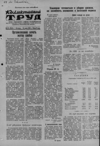 IH <> V - T Пролетарии всех стран. соединяйтесьI ICbUMJcmu&mu Усиленно готовиться к уборке урожая, не ослаблять внимания к заготовке кормов иргая Карасукского райкома Коммунястяческой сартяи Советского Союза и районного Совета депутатов трудящихся Новосибирской области К»88 (2583) ! Пятница, 24 июля1959 г. IЦена15ноп. Организованно начаьт жатву хлевбо Труженики нашего района в первом году семилетки вырастили неплохой урожай.Многие колхозы и совхозы уже приступили к уборке ранних посевов технических и зерновых культур. В оставшиеся дни до начала массовой жатвы хлебов передовые хозяйства делают все, чтобы начать ее организованно, провести в самые короткие сроки и без потерь. От этого, прежде всего, будет зависеть выполнение районом обязательств по увеличению валовых сборов зерна, по сдаче и продаже хлеба государству. Но для того, чтобы провести уборку хлебов в минимальные сроки, необходимо отлично подготовиться к жат.вегу заблаговременно привести в рабочее состояние всю уборочную технику, правильно расставить кадры, иметь четкий план выполнения всех работ, связанных с уборкой урожая. К сожалению, ход ремон та уборочных машин в районе вызывает тревогу и опасения. На 22 июля план ремонта комбайнов выполнен только на 63 процента, жаток на 72 , а подборщиков на 30.Медленно готовятся к работе крытые тока,зернохранилища, зерноочистительные машины и механизированные погрузчики. А некоторые хозяйства до сего времени не сумели подготовить даже половину имеющейся уборочной техники. Особенно неблагополучно с ремонтом машнн в колхозах им. Тельмана, им. Жданова, „Шперед к коммунизму" и им. Куйбышева. В этих артелях подготовлено к работе всего по 2—3 комбайна и такое же количество лафетных жаток, совсем не отремонтированы подборщики. Очень слабо готовятся к жатве колхозы „Маяк Ильича", „Новая семья" и совхоз им. Дзержинского. Еще хуже обстоят дела с готовностью к уборке хлебов в отдельных бригадах и на фермах. Так, например, на тестой ферме совхоза им. Дзержинского из десяти имеющихся комбайнов на 20 июля к работе был подготовлен только один. Ферма плана уборочных работ не имеет, расстановка технвки и людей не произведена, крытый ток не расчищен, неполностью готовы и зерноочистительные машины. Подобное положение и во второй бригаде колхоза им Жданова, где готовятся к уборке только три комбайна, а к ремонту остальных комбайнов и лафетных жаток еще не приступали, ссылаясь на отсутствие людей. Все эти и многие другие недостатки должны серьез но встревожить руководителей хозяйств, партийные, профсоюзные и комсомольские органнзации. Необходимо в оставшееся короткое время до начала массовой жатвы хлебов все внимание колхозников, механизаторов и рабочих направить на завер шение ремонта всех уборочных и зерноочистительных машин, подготовку токов, зернохранилищ и других средств. Нужно теперь же, не откладывая ни на один день, заняться комплектованием агрегатов, расстановкой кадров, составлением четких планов проведения косовицы н обмолота хлебов. Товарищи хлеборобы и механизаторы! Быстрее приводите в готовность уборочную технику! Помните, что хорошая и своевременная подготовка к жатве является первейшим условием успешной битвы за хлеб, успешного завершения всего сельскохозяйственного года. В поле вышло пять жаток В колхозе „Маяк Ильи' чаи рыжик засеян на
