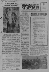 o u t f ~ C Спраздникомвас, товаоищи строители! Доброе слово о строителях Каждый праздник советские людиотмечают трудовыми достижениями. Инаш коллектив строительного поезда - 662, прибывшийпо путевке Свердловского совнархоза в распоряжение СМУ «Запсибхлебо- строя», тоже неплохо встречает свойтрадиционный праздник. Работая на сооружении Ка- расугсскогоэлеватора и зерноскладов, многие строители дают по три'с лишним нормы выработки. Взять, к примеру, арматурный цех. Здесь трудно найти отстающего. А такие товарищи, как Носенко, Корбут, Душечкин смены заканчивают тремя нормами. Любят на славу трудиться и в бри« гаде т. Мягкова. На строительстве электростанции* в Зубково они выполнили месячное задание на 203 процента. А каменщики из этой же бригады тт, Рудаков, Королева, Васильева, Плотнина, Загвоз- ☆ ☆ ☆ У опытного мастера Давно трудится каменщиком А. Ф. Мельниченко. Это теперь уже опытный мастер своего дела. К нему посылают на выучку молодежь. &нею он и возводит стены гостиницы. Это сейчас основная работа на объекте. Успехи па стройплощадке в основном достигнуты за счет каменщиков. А успехи есть и немалые. Производственный план ежемесячно выполняется на 120—125 процентов. Изо дня в день даютбольше нормы ученики каменщика Ю.Глу- '-^Годет, А. Насточенко и иеко-. торые другие. Пролетарии Шея стран<соединяетесь! iCbUueJcmiMmu п и т J 950 АВГУСТ 9 Воскресенье № 95 (2590) <урган карагукского райкома Коммунистической «дрти* Советского Союза и районного Совета депутаток трудяшихся Новосибирской области И Цена 15 коп. f i!ui [ii!i!iii;iiiii]iiii[iiiiniii!iiiiiBi КОЛХОЗНЫЕ НОВОСТРОЙКИ В колхозе им. Куйбышева с каждым днемусиливаются строительные работы но сооружению скотопомещенпй и жилых домов для колхозников. Правлением оказана помощь 30 хозяйствам в индивидуальном строительстве. Полным ходом ведется строительство коровника на 250 голов. Широко используется здесь местный строительный материал. К завершению идут работы по сооружению птичника на 300 голов в третьей бригаде. На днях была optизведена по- мазка стен. В этой работе приняло участие более 20 колхозников. Образцы труда в этот день показали Ж. Ал ь бе кова, М. Нуржанова, К. Мажикпаева, Ж. Сарсенова и другие. В. Скопич. | В связи с Днем строителя за высокие показатели в работе на районную Доску почета заносятся и на - граждаются Почетными грамотами райисполкома: I I I дин, Гобов дают, по 3-05 процентов. Уместно сегодня сказать доброеслово и о наших товарищах, которые сооружают третий силосный корпус. Очень сложные работы выполнял на демонтаже т. Белевич. И все же его дневная выработка выходила за пределы двух и даже трех норм. Такие же показатели имеет и плотник т. Голованов. Радостно на душе в День строителя и у наших трудолюбивых штукатуров тт. Поповой, Хоролец, Десятовой и других, каждая из которых выполнила месячное задание более чем в два раза. II если коллектив нашего поезда заявил о своем стремлении выполнить семилетку за три с половиной года, то в этом не может быть сомнения. И. Огородников, гомендант стройпоезда-662. Учителя подают пример трудолюбия Учителя Акпановской школы сразу поокончании отпуска пришли к руководителю седьмой бригады артели «Путь Ленина». —Хотимпомочьколхозу своим трудом,—заявил Б. Гумаров от имени своих товарищей. —Отдохнули мы хорошо, а до начала занятий в школе еще месяц. —Что ж, спасибо. Рабочие руки нам нуж