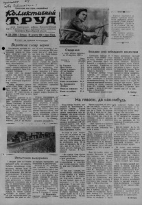 Пролетарии всех стран, соединяйтесь! z' •jTjCbUueJcmu&isiu ирган Карагукгкого райкома Коммунистической яартим Советского Сонма и районного Совета депутаток трудящихся Новосибирской области №103 (2598) I Пятница, 28 августа 1959 г,1Цена 15 коп. В ответ на призыв коченевцев Водители слову верны В Обсуждение призыва коченевцев за счет перевы- , ( полнения планов по пере- * возке зерна на 5 дней со кратить установленные сроки транспортировки хлеба нового урожая нашло горячий отклик у водителей нашего автохозяйства. —Выполню в августе два плана!—заверил опытный водитель коммунист Иван Аба- кумович Соловьев. Слово свое он держит крепко: еще август не кончился, а на счету Ивана Абакумовича уже около 4 тыс. центнеров перевезенных грузов. Славно трудится' комсомолец Иван Киба. На вто- • рую декаду августа ему было доведено задание перевезти 65 тонн грузов, а перевез он 348 тонн—в пять раз больше! Хороших успехов на перевозке хлеба нового урожая добивается водитель Леонид Костенко. За истек- шую декаду он перевеззер- Т на в четыре раза больше задания; 3177 тонна-километров сделал он за это время вместо 1300. ‘ Доброй славой за примерный труд пользуется шофер Иван Бабич. Он на своей машине „ЗИС -5 “ за последние 10 дней доставил в закрома государства 338 тонн хлеба. Это в 4,5 раза больше того, что было определено ему заданием. В социалистических обязательствах, принятых накануне страды, мы давали слово использовать 18 большегрузных прицепов. С этим мы справились. Сейчас у нас в работе 20 двух осных прицепов и 8 полуприцепов. Они используются за более мощными машинами и закреплены за самыми опытными водителями. И направляются такие поезда прежде всего туда, где образуется скопление зерна на токах. — За один рейс я доставляю более 8 тонн хлеба,— говорит шофер Василий Ди- бров. Успехи передовиков по" зволят автохозяйству с августовским заданием управиться досрочно, а годовой план выполнить к дню открытия предстоящего Пленума ЦК КПСС . Наш коллектив борется сейчас также за сокращение себестоимости перевозок грузов в среднем на . один процент. А. Лучин,■* начальник автохозяйства. 1 Испытание выдержано С каждый днем всё больше прибывает хлеба на элеватор. Особенно напряженные сутки на нашем участке были 19 августа. В этом году они явились испытанием для рабочих и руководителей. К разгрузочной площадке одна за другой, а то и несколько сразу подходили автомашины с зерном. Положение осложнялось еще и тем, что администрация элеватора своевременно не приняла всех мер, чтобы обеспечить нормальную работу сушилок и складов. На нашей сушилке ^.«СОБ МК» не хватает рабочих рук, механизмы имеют ряд недоделок. Нас даже не смогли снабдить техстропами для пневматики и транспортёров. Несмотря на это, заведующий сушилкой т. Вакуленко сумел организовать работу так, что механизмы не останавливались ни на минуту. По сути героизм в труде проявил коллектив сушилки 19 августа. Многие товарищи трудились по 18 часов к ряду, а некоторые—даже круглые сутки. Вот они герои дня: транспор- терщики 0. Кидясова и Т. Ер- по, слесари В. Лавриненко и Н. Рещетников, сушильный мастер В. Соколова и другие. Н. Кириченко, помощник заведующего складом сушилки „СОБ-МК”. s ' ■ , »■ дч т ■ Хорошо трудится на уборке урожая машинист лафетной жатки колхоза „Путь Ленина" Кемеровского р а й о н а В. А . Головин. За смену он скашивает 20