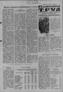 9 сентября 1959 года, № 108 КОЛЛЕКТИВНЫЙ ТРУД 3 С ТРУДОВЫМ ПОДЪЕМОМ Сдерживают вспашку зяби Завершила уборку зерновых третья ферма совхоза «Октябрь». Не умолкая днем и ночью, здесь работали агрегаты комбайнеров Кондрата Бух- миллера, Михаила Кротова, Михаила Головатого и Давида Бальде.Они убирали ежесменно по 25—30 гектаров хлебов, нередко покидая свои загонки в 5 часов утра. Боевой дух хлеборобов чувствуется не только на полосе, но и на току. Зерно сюда поступает без задержек, быстро подрабатывается и отправляется государству, а семена засыпаются в склады. На склады уже отправлено 1000 ц пшеницы, 200 ц ячменя и 400 ц овса. Зерноочистительной техники на току достаточно. Два зернопульта, два автопогрузчика, веялка и BUM работают круглосуточно. До 10 сентября мы решили полностью управиться с хлебом. Стремятся к этому все рабочие фермы и сначала уборки трудятся без выходных. Взять хотя бы женщин Фриду Рем, Анастасию Савченко, Марию Рей, Надежду Аликову. Постоянно работая на зернопульте, они пропускают за день по 500— 600 центнеров шпе- | ницы. Когда на току большое скопление зерна, мы пускаем второй зернопульт. Провеянные вороха зерна мы еще раз пропускаем через ВИМ. Когда меня спрашивают, кто же показывает высокие образцы труда, я нередко за* трудняюсь ответить на это. г Все рабочие прониклись- высоким чувством ответственности за судьбу урожая, трудятся с неослабным напряжением. Верно, были некоторые казусы с горожанами. Некоторые из них хотели меньше поработать, по больше заработать. Но глядя на своих же товарищей, работающих с полной нагрузкой и безотказно, они стали трудиться лучше. Что кроме похвалы можно сказать о тт. Григорович, Ниваровой и Зоммер? Вместо четырех человек на веялке «ВС-8» они работают трое, но ежедневно перевыполняют нормы. А наши шоферы Петр Иовенко и Иван Бальде почти круглые сутки не выпускают из рук баранку. Я не слышал от них ни жалоб, ни обид на трудности. Нередко, отдохнув 3-4 часа в сутки, ови снова начинают трудовой день. На отвозке зерна от комбайнов они делают по 14 рейсов, доставляя на ток по 450— 470 центнеров зерна. — Отдохнем после жатвы, а сейчас время— золото,— говорят они. В это горячее время хлеборобам действительно некогда отдыхать. Но посмотреть кино, послушать беседу, почитать свежую газету труженики полей должны. Однако возможности этой они не имеют. В клубе картины не демонстрируют, так как кинобудка неисправна, а непосредственно в поле передвижка почему-то не появляется. Забыли о нас и работники рабкоона вместе с председателем т. Дудко. Не доставляют нам товары первой необходимости. Приходится за папиросами, за мылом терять на ходьбу в Студеное по два часа дорогого времени и ждать, когда в 9 часов утра откроется магазин. Такого беспечного отношения к запросам хлеборобов здесь еще ни один год не наблюдалось. М. Гориинченко, управляющий фермой. доярки района (,Показатели за 8 месяцев в литрах) Колхоз „Дуть Ленина" Герман А. К. 2155 Гебель Л. Е. 1975 Моор А. А. 1792 Михейлис М. А. 1781 Дорнес М. П. 1761 Авик Э. А. 1689 Лазурно Е. А. 1683 Шнайдер А. Д. 1670 Гидион Е. Ф. 1634 НурмухамбетоваУ. 1625 Кнаус Л. Е. 1611 Кулибер М. Г. 1610 Бейфус Э. К. 1589 Молькина А. А. 1588 Мусалдинова С. 1570 Май А. Я. 1559 Крупская Е. Д. 1555 Швиндт О.А. 1543 Колено Л. П. 1542 Привалова Л. М. 1523 Гроо И. 1499 Тимель М.. П. 1495 ГринченкоВ. П. 1484 Ергерт М. X. 1459 Семисильная Г. . 1450 Гарт М. А. 1450 Ергерт Е. Г. 1409 Совхоз им, Д