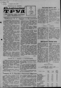 -s Пролетарии всех стран, соединяйтесь! 1CbUU£Jcmu&H£iU 1 ч й *И44М!.:1.: к :. г .сл ь а ирган Карасукского райкома Коммунистической ■артии Советского Союза в районного Совета депутатов трудящих' I Новосибирской области 1»«® Октябрь 9 л» Пятница 121(2616) Цена 15 коп. 5 'октября?Первый секретарь Центрального Комитета КПСС, Председатель Совета Министров СССР Н. С. Хрущев посетил ордена Ленина Дальзавод. Собравшиеся у входа на завод рабочие, инженеры, техники и служащие тепло встретили дорогого гостя. Начинается митинг трудящихся Дальзаво- да. На митинге с большой речью, часто прерываемой аплодисментами, выступили. С .Хрущев. В своем выступлении он осветил некоторые вопросы внутренней и ввешней политики. Речь Н. С. Хрущева была выслушана с исключительным вниманием. После окончания митинга Н. С. Хрущев осмотрел завод. Он побывал в доке, где в это время находился огромный рефрижератор №12, интересовался ходом докования. Теплые, задушевные встречи с рабочим коллективом состоялись . в цехе № 6. Н. С. Хрущев останавливается у строгального станка большой мощности, где в это время работает передовик производства строгальщик тов. Чураков. Он рассказывает Н. С. Хрущеву, что перешел на обслуживание двух станков. Несколько минут беседовал Н. С. Хрущев с другим многостаночником— токарем-карусельщиком тов. Бондаревым. В цехе Н. С. Хрущева окружила рабочая молодежь— пополнение ремесленных училищ. Они говорят, это очень замечательно, что приезд Н. С. Хрущева во Владивосток совпал с пуском в космическое пространство новой, третьей по счету мощной ракеты с уникальным оборудованием. Молодые рабочие сделали в свободное время чудесный подарок червиль- нвцу из нержавеющей стали и пластмассы, изображающую советскую космическую ракету. Подарок торжественно вручается Я. С. Хрущеву. Из цеха №“ 6 Н. С. Хрущев проходит по Пирсу завода, где его ожидает морское прогулочное быстроходное судно с красивыми обводами. Он прощается с рабочими Дальзавода, поднимается на борт судна. Начинается поездка по залитой щедрым солнцем глади бухОтъезд Н, С. Хрущева из Владивостока 7 октября утром на владивостокском аэродроме собрались трудящиеся города, чтобы проводить дорогого гостя—Первого секретаря Центрального Комитета КПСС и Председателя Совета Министров СССР Н. С. Хрущева. На всем пути к аэродрому— алые полотнища, на которых пожелания Н. С. Хрущеву счастливого пути. На бетонной площадке уже стоит, приготовившись к дальнему полету, воздушный корабль «ИЛ-18». Показывается кортеж машин. Впереди на открытом автомобиле— Н. С. Хрущев и сопровождающие его лица. Н. С. Хрущев выходит из автомобиля и отвечает на громкие аплодисменты и приветствия провожающих. Множество цветов преподносится дорогому гостю. Н. С. Хрущев поднимается по трапу самолв' та, улыбаясь, долго машет провожающим рукой. Снова среди провожающих возникает овация, гремят, сливаясь с аплодисментами, слова: «Счастливого пути Вам, дорогой Никита Сергеевич, желаем доброго здоровья и многих, многих лет жизни!» Ровно в 10 часов по владивостокскому времени «ИЛ-18» поднимается в воздух. (ТАСС). Товарищ Н. С. Хрущев в Иркутске и Братске Когда дружно берутся за дело Пребывание Н. С. Хрущева во Владивостоке ты Золотой рог. Н. С. Хрущев осматривает величественную панораму города-порта, раскинувшегося по склонам сопок. Везде— на кораблях, причалах,
