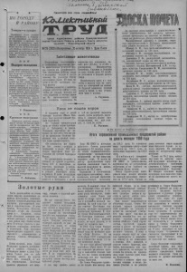 / С -/ у X jU - b A ' „ ^ Г L S f \ S ^ § C Z ^ Q •/ Zp 0 - и1КлЛ^Лх^ 1 cMuua^iT7<L--ajC Пролетарии всех стран, соединяйтесь! $С Ь иие!сггиШ т й s 2= :-* # = ц /УО ГОРОДУ I Я РАЙОНУ| Товары—в кредит ij Немногим более десяти \\ дней работают в Карасу- У ке два магазина по проба- jj же товаров в кредит. За !| это время население при- ji обрело в рассрочку товаров ij более чем на 44 тысячи руб- |1 лей. Особым спросом у поку• ;; пателей пользуются ради- I! олы, радиоприемники, гар- ij монии, готовые платья и I! другие товары. ☆ ☆ ☆ ' Подарок молодежи Хороший подарок к правд- И нику 42-й годовщины Октя- !! бря получит молодежь села У Вучугур. В центре его за- |] канчивается ’ строитель- ii ство большого типового ii клуба на 300 мест. Строи- I тели обязались сдать его в Ц эксплуатацию к 7 ноября, ii Сейчас они ведут последние У внутриотделочные работы. I В нем будут размещаться I радиоузел и библиотека. I Торжественно планируется здесь отметить праздник Октября и открытие клуба. Готовится доклад, концерт художественной самодеятельности. Г , Ромащенко. ☆ ☆ ☆ Крупные выигрыши Сберкассы района выплатили свыше 20 тысяч рублей по выигрышам на денежно-вещевую лотерею 3-го выпуска. Среди вещей много таких, как ковры, швейные машины, радиолы, радиограммофоны, фотоаппараты и многие другие. Лидии Киселевой посчастливилось выиграть две швейных машины—ручную и ножную. Срадостью она приобрела лотерейные билеты 4-го выпуска. А держатель Государственного 3-процентного выигрышного займа гр-н 1 П. в дополнительном 12 \ тираже выиграл■12,5 ты- \ сячи рублей. Немалые сум- I мы выплачиваем мы теперь I и по выигрышным счетам. I Так, гражданину Н. к ос- \ татку вкладов причисле- i но 1275 рублей. Оплата выигрышей про- | должавтся. Г. Лобыкин. ирган карасуксного райкома Коммунистической партии Советского Союза и районного Совета депутатов трудящих' I Новосибирской области №128(2623)(Воскресенье,25октября 1959 г.!Цена15коп. Заботливые животноводы По-хозяйски подготовились перевозке его ежедневно за- к стойловому содержанию еко- нято два :«ДТ-54» и «С-80» с та животноводы четвертой фер- волокушами. Механизаторы мы совхоза им. Дзержинского. Богаченко, Сульмин и Осинцев Они обеспечили дойному стаду за один только день 21 октяб- и молодняку теплую и сытую ря доставили к фермам десять зимовку. На условную голову скирд. заготовлено более 10 тонн си- Позаботились здесь и о том, лоса и по 12 центнеров гру- ЧТ05Ы в Морозы скот не выго- бых кормов. нять из помещений на поение. Рабочие совместно с животно- q t буровой скважины подвели водами заботятся сейчас о том, тр^бы к базам, а там устано- чтобы до начала холодов все види чавы и колоды, i сено подвезти к местам аимов- | ки. Из заготовленного сена А. Глушков, уже половина перевезена. На завхоз. Урок не пошел впрок В прошлом году в пятой и той же просьбой выделить бригаде колхоза «Маяк Иль- людей, чтобы перебрать карто- ича» был получен низкий уро- фель и накрыть крышу ово- жай картофеля. щехранидища, тот, как говоНо горький прошлогодний рят, и ухом не ведет, урок не пошел впрок бригади- Е. Рысиаев. ру т. Циберкину и вынче. Посадили картофель не воЗа высокие показатели в социалистическом соревновании по выпуску промышленной продукции по итогам за девять месяцев на районную Доску почета заносятся: Мясокомбинат [директор т. Аношкин, секретарь парторганизации т. Коетыря), выполнивший план девяти месяцев на 128,3 проц. Ш ми д т А. И., боец скот