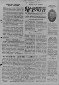 ‘~ ч Закоинлачработувтоарясесяси ВреховноСогвеота РСФСР !р с > и Пролетария всех стран, соединяетесь! 26 ноября на второй сессии Верховного Совета РСФСР пятого созыва было принято решение о прекращении прений по докладам о Государственном плане развития народного хозяйства РСФСР на 1960 год, о Государственном бюджете республики на 1960 год и об исполнении бюджета за 1958 год. Всего высказалось 29 человек. С заключительным словом выступает заместитель Председателя Совета Министров РСФСР, председатель Госплана РСФСР депутат В. Н. Новиков. Сессия единогласно принимает Закон о Государственном плане развития народного хозяйства РСФСР на 1960 год. После заключительного слова министра финансов РСФСР депутата И. И. Фадеева также единогласно принимается Закон о Государственном бюджете РСФСР на 1960 год и Постановление об утверждении отчета об исполнении бюджета за 1958 год. Сессия переходит к рассмотрению третьего вопроса повестки дня. Слово для доклада о проекте Закона о порядке отзыва депутата Верховного Совета РСФСР предоставляется председателю Комиссии законодательных предположений Верховного Совета республики депутату В. И. Крестьянинову. После обсуждения сессия единогласно принимает Закон о порядке отзыва депутата Верховного Совета РСФСР. С докладом об утверждении Указов Президиума Верховного Совета РСФСР, принятых после первой сессии, выступил секретарь Президиума Верховного Совета РСФСР С. Д. Орлов. Указы утверждаются. Затем сессия по предложению депутата П. Н. Поспелова обсудила вопрос о Председателе Президиума Верховного Совета РСФСР. В связи с тем, что Н. Г. Игнатову необходимо находиться на основной работе секретаря ЦК КПСС, сессия освободила его от обязанностей Председателя Президиума Верховного Со* вета РСФСР. Председателем Президиума Верховного Совета избирается депутат Н. Н Органов. Вторая сессия Верховного Совета РСФСР объявляется закрытой. (ТАСС). ВОЖАН МОЛОДЕЖИ Молодому коммунисту Токторбаю Апаеву любая работа по плечу. Летом он водил трактор, а сейчас по- шел скотником на ферму. В седьмой бригаде колхоза „Маяк Ильича" он является секретарем комсомольской организации. Личным примером и советом комсомольский вожак увлекает молодежь на славные трудовые дела. Когда был объявлен декадник по вывозке соломы с полей, тов. Апаев оказал немалую помощь бригадиру в организации молодёжи для круглосуточной работы, и сам принимал активное участие в вывозке соломы в ночное время. Замечательно потрудились на этой работе молодые трактористы братья Асембаевы, возчики А. Резвых, К. Му- сенов, А. Ахметов. На тракторе „ДТ-54" волокушей и тгосом они подвезли к животноводческой ферме около 700 ц соломы. Ж. Сраилов, бригадир, iG K iu e J c m u & H sm ц Орган Караеукскогорайкома Коммунистической партии Советского Союза и районного Совета депутатов трудящихся Новосибирской области - №142(2В37)1Воснреш’Ьй, 29ноябпя 1959г. ЦIеня15коп. Впереди— комсомольцы Молодежь колхоза имени Жданова, выполняя решения XXXIII комсомольской конференции, приступила к вывозке удобрений на поля. В проведенном недавно воскреснике с огоньком потрудились комсомольцы зоотехник Тамара Беккер, зав. библиотекой Пидчя Чех. колхозники Анатолий Мурын- ченко, Василий Овечкин, Григорий Пискарев. Они вывезли на кукурузное поле 18 тонн навоза. По-комсомольски относятся юноши и девушки к вы