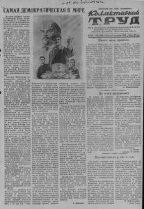 САМАЯ ДЕМОКРАТИЧЕСКАЯ В МИРЕ Во время недавней поездки в Соединенные Штаты Америки товарищ Н. С. Хрущев, отвечая одному из американских деятелей, ретиво восхвалявшему капиталистические порядки, сказал: — Вы говорите: главный двигатель энергии людей, ума, инициативы— это нажива, или, по вашему, бизнес. Мы говорим другое: главный двигатель— это сознание человека, сознание того, что он свободен, работает на себя, па своих близких, на свое общество, что средства производства принадлежат обществу, а не отдельной личности, которая наживается на эксплуатации чужого труда. За этими словами—два мира, два общественных строя, два образа жизни. Они кратко и выразительно раскрывают существо наших социалистических порядков, закрепленных Советской Ковститупией, день которой мы отмечаем ежегодно, как всенародный праздник. Советская Конституция законодательно закрепила то, что добыто народами нашей страны под руководством ленинской партии коммунистов. Чем близка и дорога советским людям паша Конституция. почему мы называем ее, по выражению народного акына Казахстана Джамбула. Великим Советским Законом? Потому, что наша Конституция отвечает коренным интересам труднщихся всех национальностей, выражает их волю. Если буржуазные конституции исходят из незыблемости частной, капиталистический собственности на спедства производства, то экономическую основу Советский Конституции составляет общественная, социалистическая собственность на эти средства— землю, ее недра, заводы, фабрики, шахты,—все, чем богато общество. Отсюда не корыстное стремление к наживе люб' й ценой, как в капшалистичгских гтра- нах, характерно для СССР, а сотрудничество и взаимопомощь миллионов людей, их забота об общем благе, общем счастье. Именно об этом свидетельствуют всенародное соревнование за досрочное выполнение заданий семилетки, могучее движение бригад и ударников коммунистического труда. благородные дела прядильщицы Валентины Гагановой и ее последователей, трудовые подвиги рязанских колхозниц, добившихся выдающихся успехов в подъеме общественного жив 'тноводства. Вся власть в СССР принадлежит трудящимся города и дер-вни в лице Советов депутатов трудящихся. В отличие от фал» шивой, урезанной демократии капиталистических государств, демократии для эксплуататорского меньшинства, советская демократия является демократией для всего народа. «Советы, — указыгал Р. И Ленин,— созданы самими трудящимися, их революционной энергией и творчеством, и только в атом лежит залог того, что они работают всецело на осуществление интересов масс» (Соч., т. 26, стр. ЗиЗ — 304). Пролетарии всех стран, соединяетесь! 4CbdJ£Jcm utM&& #*- Орган Карасукского райкома Коммунистической партии Советского Союза и районного Совета депутатов трудящихся Новосибирской области №144-145(2640)1 Суббота,5декабря 1959 г.IЦеня30коп. Знает цену времени Избираемые на основе всеобщего, прямого и равного избирательного права при тайном голосовании, наши Советы являются органами подлинного народного представительства, осуществляют всю полноту власти в стране. Уже одно только число депутатов Сонетов— около двух миллионов человек— показывает, насколько глубоко 5зм( «ратичен наш строй, какая огромная масса людей непосредственно управляет государством. Советская Конституция близка и Д'-рога нам потому, что она