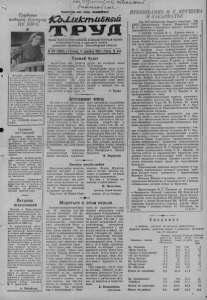 U t L i . \ л/ l j (K f ^ и ^ о л Л ^ С О ^ T n a J L ^ Трудовые подарки Пленуму ЦК КПСС ★ Молодая свинарка сова-о- ва имени III<вченко Сторобельсного рииьна комсомол- га Лидия Саоенко в честь декабрьского Пленума ЦК И К С решила досрочно выполнить свое годовое обязательство—получить не менее SO поросят от каждой из SO свиноматок. Год еще не кончился, а передовая свинарка уоне получила в <реднем по 28 поросят от свиноматки. Л. Совенка не только хорошо трудится, ной нохооит время для учебы. Она занимается на заочном отделении Успенского зооветеринарного техникума. НА СНИМКЕ: Лидия Са- венко. 11ерешли на 7-часовой Радостное событии про- изошло в Донь Конституции jj у кврпсукекпх ЖСЛРЗНОДО- I) рож пиков. 5 денпЛря все!; службы Воронин на 7-иасо- I вой рабочим день. Наряду о :j этим заработная плата трап-;! (■портянкой неуклонио повы- :; шастся. jj Некоторые железнодорож-:; нпки—составительские брига- ДЫ, грузчики— выполняют;! тот же объем работы. Эго:; говорит о росте производи- jj тельности труда. Но теперь :| они располагают для отдыха:; большом временем и заработ-1| кп воднялвсь. Это—пачало осушеств.те-:; нпя постановления партии н : правительства о переводе a jj 1960 юду в, ех рабочих и!; служащих на шести-семи-j часовой рабочий деиь. Пролетария всех страв, соединяйтесь* 1СЬи.ы1сти&ш й Орган Карасукского райкома Коммунистической партии Советского Союза и районного Сонета депутатом трудящихся Новосибирской области №147(2642) j Пятница, 1 декабря 1959 г.1Цена 15 копУрожай После того, кук прошли бураны и снегопады и поля затянуло снежным,, покровом, колхозники первой бригады колхоза „Новая семья“ приступили к снегозадержанию. На днях тракторист Александр Ми- стюк угольником нарезал снежные валы на расстоянии десяти метров друг от будет друга на площади около 70 гектаров. Накапливают здесь и местные удобрения. По утрам, отправляясь в поле за сеном, колхозники нагружают на тракторные сани навоз из животноводческих помещений и вывозят его на поля. С. Будко. Заготавливают шь'ш Из года в год увеличивается животноводство в колхозе им. Тельмана. В связи с этим возникает и потребность увеличения строительства скотопомещений. Хороший коровник на 260 голов построен в этом году в первой бригаде. Животноводы второй бригады хотят иметь и у себя такое яге типовое добротное помещение. Здесь запланировано построить четырехрядный коровник на 300 голов и телятник во „ч-й бригаде. Располагая хорошими возможностями использования местного строительного материала, коллективы бригад приступили к заготовке камыша. За две недели на территорию бригад доставлено около 700 кубометров. Колхозники первой бригады заготовили 260 кубометров, второй-300 и третьей—около 100. На косовице камыша старательно трудятся косари на конных сенокосилках Николай Чаус, Николай Бондаренко и Андрей Гренц из первой бригады. Еще лучших результатов добились члены второй бригады Николай Ефремов, Яков Никифоров и Леонид Васильев. И. Марфуннн, Пример трудолюбия Ежегодно, когда животноводство вст\ пает в зиму, колхозница Евдокия Щипо- тина набиряет группу телят. В прошлом году она добилась стопроцентного их сохранения. Нынче снова набрала 10 телят и заботливо ухаживает за ними. Под стать ей Мария Новаковская. Федор Жукатин- ский и Степан Кочкин, которые ухаживают за более взрослым молодняком. Все они с лн бовью относятся к своей работе. И. Ноло