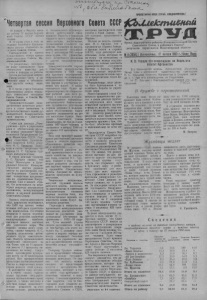 4 * * ! Ф V i S . 0 U-X]I I I <-& гГЪ с& л Д ^ ПРОЛЕТАРИИ ВСЕХ СТРАЙ, СОЕДИНЯЙТЕСЬ! Четвертая сессия Вреохвонго 14 января в Москве начала работу IV сессия Верховного Совета СССР пятого созыва. В 10 часов утра в зале заседаний Большого Кремлевского дворца открылось заседание Совета Союза. Одновременно в здании Кремлевского театра проходило заседание Совета Национальностей. На раздельных заседаниях палат единогласно была утверждена повестка дня сессии и порядок ее работы. Сессия рассмотрела вопрос: Разоружение—путь к уп- ^Шочению мира и обеспече- 1 ?ию дружбы между народами. В 11 часов утра в Большом Кремлевском дворце открылось совместное заседание Совета Союза и Совета Национальностей. Продолжительными аплодисментами встретили депутаты и гости появление в прг вительственных ложах руководителей Коммунистической партии и Советского правительства. Слово для доклада „Разоружение-путь к упрочению мира и обеспечению дружбы между народами" предоставляется Председателю Совета Министров СССР,' Пер- ф м у секретарю Центрального Комитета КПСС депутату Н. С. Хрущеву. Депу- .^,-таты и гости встречают товарища Н. С. Хрущева бурными аплодисментами. В своем докладе товарищ Н. С. Хрущев сказал, что Совет Министров и Центральный Комитет Коммунистической партии решили внести на рассмотрение сессии Верховного Совета новые конкретные предложения но сокращению Вооруженных Сил в нашей стране. Он остановился на некоторых вопросах внутреннего положения, международной жизни и внешней политики Советского Союза. Касаясь итогов минувшего года, докладчик подчеркнул, что 1959 год принес новые великие победы в строительстве коммунизма. Он открыл широкую и ясную перспективу для решения коренных международных проблем, - имеющих важное значение для упрочения мира. 'Мы хорошо начали нашу семилетку, сказал товарищ Н. С. Хрущев, результаты всенародного труда замечательные. Выпуск промышленной продукции увеличился за год более чем на 11 процентов вместо 7,7 процента, намеченных по плану. Сверх плана произведено продукции почти на 50 миллиардов рублей. Вея промышленная продукция дореволюционной России в современных ценах стоила меньше этой суммы. В минувшем году вступило в строй свыше тысячи новых крупных государственных промышленных предприятий, а также введены в -> действие новые производственные мощности за счет реконструкции, расширения и технического перевооружения действующих предприятий. Радость и законную гордость всего народа вызывают победы, достигнутые, тружениками сельского хозяйства. Несмотря на засуху, хлеба закуплено государством 2 миллиарда 846 миллионов пудов, что удовлетворяет потребности населения и другие государственные нужды. Коммунистическая партия и Советское правительство осуществили в 1959 году ряд крупных мероприятий, направленных на повышение материального благосостояния народа и улучшение условий его жизни. К концу нынешнего года будет завершен перевод на сокращенный рабочий день всех рабочих и служащих в стране. Непрерывное повышение материального благосостояния трудящихся, улучшение охраны здоровья и медицинского обслуживания благоприятно сказываются на росте населения страны. Население Советского Союза увеличилось за год наЗ миллиона 660 тысяч человек и составляет к началу 1960 года свыше 212 миллионов человек. Весь мир признает вы