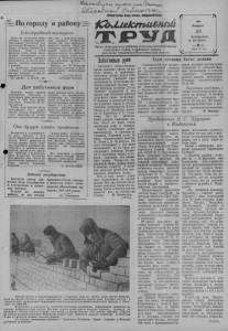 ')*у<Л . CuAt. ^ U Jj La^P v 'ty ic U ^ , ПРОЛЕТАРИИ ВСЕХ СТРАН, СОЕДИНЯЙТЕСЬ! По городу и району; Благородный поступок Ю к Ш к т и Ш м Всего на несколько минут оставил у привязи норовистую лошадь бухгалтер колхоза имени Жданова т. Дым- ченко. Лошадь оторвалась и умчалась, увозя с собой крупную сумму денег, полученную бухгалтером в госбанке для выдачи зарплаты колхозникам, и многие документы, которые находились в кошеве. Т. Дымченко немедленно сообщил о случившемся в отделение милиции, а сам отправился на поиски. Не прошло и дееяти минут, как у дежурного милиции раздался телефонный звонок. Из депо железнодорожной' станции Карасук-1 сообщили, что машинист паровоза” Николай Белугин, рискуя попасть под разгоряченную лошадь, сумел остановить ее. Вскоре сюда прибыли работники милиции н т. Дымченко. : Приняв от И. Белугина документы и деньги, т. Дымченко горячо поблагодарил машиниста. А. СТЕПАНОВ, лейтенант милиции. Для работников ферм Большие суммы средств отчисляются ежегодно в культурный фонд райпотребсоюза. В. 1959 году, например, было отчислено 56 тысяч рублей. Чтобы этим фондом могло пользоваться как можно больше членов потребительского общества, на конференции уполномоченные пайщики решили часть его расходовать на приобретение литературы по передовому опыту в сельском хозяйстве, культинвентаря, родиоирием- ников и т. и. для красных уголков животноводческих ферм колхозов и совхозов. Рещено также на каждой фермй организовать ларек без продавца. А. ЯКОВЛЕВ. Они будут иметь профессии Интересно н содержательно вдут занятия в 9—а классе Барасуксксй средней школы. Класс равделен на четыре группы. Часть девочек овлааевает швейным мастерством в кабинете домо- кводства, другая часть прохо- гдит практику в хирургическом отделении больницы. Эти девочки уже могут самостоятельно наложить пластырь, сдела1Ь перевязвт больному. Группа ребяг из пяти человек обучается электромонтажному делу в эаготэерно. Так, Николай Груздев, например, уже сомогтоятельно работает на обмоточном станке. Все мальчики н девочки 9-го класса, окончив школу, вместе с аттестатом зрелости получат профессии, в. Rpyaetfkti. Орган 1Гарасукского райкома Коммунистической партии Советского Союза, и районного Совета д е п у т а т о в т р у д я щ и х с я Н о в о си б и р ск ой области I960 Февраль 2© Воскресенье № 28(2678) Цена 15 коп. Заботливые руки f Наступает ответственное время зимовки скота: на исходе корма, а животные, чувствуя весну, ведут себя неспокойно, снижают продуктивность. Работники молочно-товарной фермы Скуп словами, богат делами Семнадцатый год трудится в мастерской совхоза им. Дзержинского Николай Козлов. О таких, как он, обычно говорят: скуп словами, богат делами. Работая слесарем в цехе регулировки топливной аппаратуры, т. Козлов выполняет сменторов, которые принадлежат четвертой и седьмой фермам, отошедшим к совхозу „Октябрь*. Одновременно ведется ремонт автомашин. Осталось отремонтировать 12 из 30. пятой бригады колкоза „Путь Подготовка комбайнов, а Ленина* стараются в это т. о:5лов также сельхозинвентаря вевремя еще большей заботой ные н0Рмы на ^ 25(а ПР°* дется на фермах. В полной окружить своих животных. ,це£™®‘ магтепской „ме- готовности находятся 42 В морозы и метель регуляр- “ f аб° ™ х Вус. плуга. 60 сеялок, 800 борон, пешно заканчивают ремонт техники. В мастерской находятся - последние 5 тракЗаб