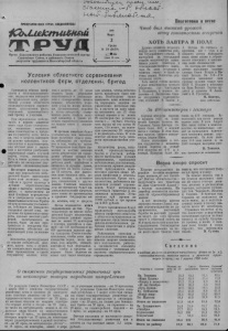 kH)-<L^QA^« - V C ^ . Q - ' S ' <^ * Л 4 , d b i^ iJ lA ^ jQ -S z .^ iz i^ S L ^ ПРОЛЕТАРИИ ВСЕХ СТРАН, СОЕДИНЯЙТЕСЬ! Подготовка к весне ifCbUueJcmdi&miu Орган Карасукскогорайкома Коммунистической партии Советского Союза и райовного Совета депутатов трудящихся Новосибирской области Условия областного соревнования ноллентиЕОв ферм, отделений, бригад Президиум обкома профсоюза и обсельхозуправле- ние, поддерживая инициативу тружеников села, разработали условия областного социалистического соревнования коллективов ферм, отделений, производственных бригад и участков. При определении победителей в первом квартале этого года будет учитываться, насколько выполнен план производства и продажи государству мяса, молена, яиц и шерсти, завершен ли ремонт тракторов, плугов,сеялок и культиваторов, как обстоит дело с вывоз- I кой и внесением удобрений, подготовкой семян, случкой коров, телок, свиноматок. Есть и такое условие:учеба рабочих по овладению двумя-тремя специальностями. Во втором квартале главным при определении победителей будет: выполнение плана сева зерновых, картофеля и других культур в лучшие агротехнические сроки с высоким качеством работ, с применением на всей площади перекрестного и узкорядного способа и прикатыванием почвы.В работе кукурузоводов учитывается, соблюден ли квадратно- гнездовой способ сева, получены ли правильные квадраты, сколько внесено удобрений, калибровались ли семена, были ли они протравлены и опудрены гексахлораном, обеспечен ли надлежащий уход за посевами. Коллектив, претендующий на звание победителя, должен, кроме того, с лучшими показателями выполнить план производства и сдачи государству молока, мяса, яиц и шерсти, до Ю июня поднять пары, образцово подготовиться к сенокошению и своевременно начать сенокос, обеспечить хороший уход за всеми посевами, организованно перейти к летне-лагерному содержанию скота, создать зеленый конвейер, а также успешно справиться с заданием по закупу скота у населения. В третьем квартале будет учитываться, как выполнен план заготовки сена и силоса, соблюдено ли требование о том, чтобы не менее 70 процентов сена было вывезено к местам зимовки скота, обеспечено ли проведение уборки урожая без потерь: зерновых за Ю—15 рабочих дней, картофеля и овощей— в лучшу.е сроки, обеспечен ли посев озимых до 25 августа, как выполнен план вспашки зяби, ремонта сеялок, культиваторов, сенокосилок и других машин. Главным показателем по прежнему будет являться выполнение квартального плана по производству и продаже государству мяса, молока, яиц и шерсти, Затем подводятся итоги соревнования за год. Претендентами на звание победителей будут коллективы, получившие урожай зерновых не менее 15 центнеров с гектара, картофеля и овощей—по 150 центнеров и по 400 центнеров зеленой массы кукурузы. Считается обязательным, чтобы план производства зерна, мяса, молока, яиц, шерсти, овощей, картофеля был перевыполнен, чтобы в среднем от коровы было надоено не менее трех тысяч килограмО снижении государственных розничных цен на некоторые товары народного потреблении По решению Совета Министров СССР с 1 марта 1960 г. снижены государственные розничные цены в среднем: на электрические швейные машины—на 20 проц., на гардинно-сетчатое полотно— на 23 проц., на меховые изделия из шкурок серебристо-чёрных лисиц и песца— на 20 проц., на ткани из на