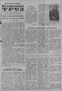 ПРОЛЕТАРИИ ВСЕХ СТРАН, СОЕДИНЯЙТЕСЬ! jC b U u e /cm u & m u Opr ih Карагукского райкома Комач\ мистической парши Согетскои* Союза и районною Совета депутатов трудящихся НовогиОи;ской области №30 (2680) I П р.ткицз , 4 маота I860г.Щеиа 15нопБыстрое готовить технику к ве с не На пороге вторая весна семилетки. Труженики вашего района взяли в этом году высокие обязательства по производству зерна и продуктов животноводства. Механизаторы и полеводы должны обеспечить урожайность зерновых не менее 12 ц с гектара, добиться валового сбора более 7 млн. пудов хлеба, вырастить на каждом гектаре зеленой массы зы не менее 300 ц. тобы завоевать намеченные рубежи и с честью вы» полнить взятые обязательства, необходимо образцово подготовить технику к весне. Нет сейчас более серьезной задачи, чем отличная подготовка к полевым работам. Глубоко понимая это, многие бригады, отделения и фермы хоть сейчас готовы приступить к полевым работам. Лучше других встречают весну труженики совхоза им. Дзержинского, артели «40 лет Октября» и Студеновского совхоза. К сожалеиию, не везде заботливо готовятся к весне. Возьмем такое важное дело, как ремонт тракторов. В целом по району предстоит еще отремонтировать ио менее ста машин. Немногим более половины иарка подготовлено в колхозах им. Куйбышева и «Вперед к коммунизму», а в артели «Путь Ленина» из 73 тракторов приведено в готовность только 40. Ни одного трактора не сумели поставить на линейку в феврале колхозы им. Тельмана и «Вперед к коммунизму». Только одну машину отремонтировали механизаторы артели им. Куйбышева. Особенно неблагополучно с подготовкой техники в колхозе «Маяк Ильича». Цравда, в этом хозяйстве, судя посводкам, не так уж плохо с ремонтом, но на - адом дело это попросту очковтирательство. Об этом сегодня рассказывается в нашей газете. Тревожное положение сложилось в некоторых хозяйствах с подготовкой посевных и почвообрабатывающих машин и орудий. Возьмем колхоз им. Тельмана. Здесь кроме 20 сеялок сельскохозяйственный инвентарь к полевым работам не готов. В течение двух последних месяцев сумели отремонтировать только 40 борон. Непонятно, как думают руководители артели проводить весенний сев? Не приступали в новом году к подготовке сеялок, плугов, культиваторов и другого* инвентаря в колхозах им. Куйбышева и им. Жданова. Этим хозяйствам только плугов и сеялок необходимо отремонтировать более 40. Не готова к весне даже и половина сеялок в артелях «Вперед к коммунизму» и «Путь Ленина». Не совсем благополучно с ремовгом сельхозиввентаря и в колхозе «40 лет Октября». За прошедший месяц колхозы района сумели отремонтировать только 3 сеялки, 8 плугов, 4 культиватора и 2 лущильника. Если такими темпами и дальше будет вестись подготовка техники к севу, то мы не сумеем ее закончить даже в мае. Сейчас надо удвоить, утроить напряжение на подготовке техники к весне. Проверяем готовность к севу Спокойствиепоранарушить Колхоз «Маяк Ильича» по подготовке техники к весне, как значится в официальной сводке, занимает золотую середину. Таких обычно не ругают, но и хвалить не за что. Вот этой заветной формулы середняков и придерживаются в колхозе «Маяк Ильича» те, кому подвластно изменять цифры вграфе „отремонтировано» и «процент к плану». По районной сводке значится, что в колхозе «Маяк Ильича» по состоянию на 1 марта отремонтировано 34 тракт