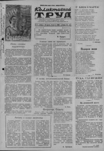 КОЛЛЕКТИВНЫЙ ТРУД 8 нарта 1960 года, № 31 Везде нужны заботливые руки В труде, как в бою Депутаты— организаторы масс Суровый 1941 год для Александры Сергеевой был особенно памятным. Отец уходит защищать Родину от фашистов. Болезнь приковала к постели мать, и она была вынуждена оставить работу на ферме. В семье не остается трудоспособных. И у шестнадцатилетней Шуры возникает решение пойти работать дояркой. И вот в один из суровых дней 1941 г. Шура с подойником в руках появляется на ферме. Все поняли, что она .пришла заменить больную мать, и без лишних вопросов стали доярки помогать Шуре ухаживать за коровами. Так началась у Шуры трудовая жизнь. Нелегкая была работа. В то время не было на ферме ни подвесных дорожек, ни автопоилок. Доярки все д е лали самиподвозили корма, вычищали навоз, поили, до ставляли молоко на приемные пункты, и сами поочередно пасли скот. Хоть и тяжело было, но Шура на трудности не жаловалась. Она знала, что на фронте, где решается судьба Родины, где ее отец, еще тяжелее. Поэтому в тылу надо было трудиться, как в бою. Но вот новое горе свалилось на плечи Шуры. В 1943 году ее отец погиб смертью храбрых. Еще усерднее трудится Шура, чтобы скорее пришла победа. И вот наступил радостный день: война окончена, враг разбит! К мирному труду вернулись славные воины. Легче стало трудиться на ферме. К работе доярки Шура привыкла и решила продолжать трудиться в животноводстве. Сегодня, в день 8 марта, Александра Романовна Сергеева отмечает свою девятнадцатую годовщину на посту доярки. Славными ее делами гордятся на второй ферме совхоза им. Дзержинского. В прошлом году Сергеева получила от каждой коровы своей группы по 2318 кг молока и заняла одно из первцх мест в совхозе. Во втором году семилетки Александра Романовна решила надоить не менее 25 ц молока от коровы. Свое обязательство она подкрепляет делами. За 2 прошедших месяца получила на корову по 265 литров и с каждым днем надои увеличиваются. Сейчас в сутки от растелившихся коров она надаивает по §—10 литров от каждой. П. Илюшин. Покупатели благодарны ей С большим старанием и любовью исполняет обязан- вости заведующей сельмагом в селе Троицком Надежда Силантьевна Владимирова. Более восьми лет трудится она в этом магазине. Когда ни зайдешь в помещение, глаз радует чистота и порядок. Все товары аккуратно и красиво равложены на полках каждого отдела, чётко выписаны наименования и цепы. Как взрослых, так и школьников, желающих что- либо купить, Надежда Силантьевна встречает одинаково вежливо и культурно обслуживает, предлагал нужные им товары. Магазин работает строго по распорядку дня. Еще не вышли какие-либо продукты или другие товары, а Н. Владимирова уже беспокоится о завозе их, чтобы не было перебоев. В летние" месяцы, когда большинство жителей села находится в поле, заведующая организует доставку необходимых им продуктов, одежды, обуви на место работы. Благодаря такой заботе и культуре обслуживания покупателей, Троицкий сельмаг ежемесячно не гтолько выполняет, но и t перекрывает доводимые задания по реализации товаров и идёт в числе передовых среди торговых точек рабкоопа совхоза им. Дзержинского. В книге жалоб и предложений в адрес Надежды Си- лантьевны можно встретить только благодарности за хороший труд. Это лучший трудовой подарок Надежды Силантьев- ны, которым она^встречает Международн