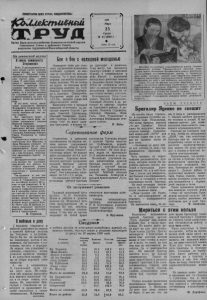 ПРОЛЕТАРИИ ВСЕХ СТРАН, СОЕДИНЯЙТЕСЬ! Я Орган Карасукскогорайкома Коммунистической партии Советского Союэа и районного Совета депутатов трудящихся Новосибирской области I960 Март 25 Среда № 37 (2687) ♦ Цена 15 коп. На ленинской вахте В смене коммуниста Стороженко Ночь. В разыгравшейся метели тускло светят электрические фонари на станции Карасук-1. Сильный поры вистый ветер забивает мокрым снегом лицо, слепит глаза. В неистовом снежном вихре и завывании многочисленных проводов плохо слышны паровозные гудки. Работать приходится осторожно, то и дело поглядывая на уходящие вдаль рельсы и прислушиваясь не идет ли паровоз, чтобы не поиасть в беду. В1 эту ночь несла вахту смена коммуниста Василия Федоровича Стороженко. Несмотря на непогоду, все ее члены прибыли на свои посты вовремя. Вот навстречу пурге с трудом идет вдоль ряда вагонов составитель поездов Николай Вирюков. При свете ручных фонарей проверяют вагоны прибывшего поезда весовщики комсомольцы Александр Лебедев, Раиса Рузманова и Павел Борблик. Стрелочники второго поста комсомолки Зоя Морозова и Дина Макарова очищают от снега переводы. Но не прекращающийся буран снова эаметает их снегом и девушки с еще большим энтузиазмом продолжают борьбу со стихией. Двенадцатичасовое дежурство прошло без малейших нарушений, все работы по обороту паровозов, формированию и отправке поездов выполнены с превышением графика Так трудится в эти дни Комсомольске - молодежная смена В. Стороженко, готовя достойную встречу 90-летию со дня рождения В И. Ленина. На состоявшемся в феврале собрании комсомольцы и молодежь смены решили стать на трудовую ленинскую вахту и заслужить по* четное звание бригады коммунистического труда, ва которое ведут упорную борьбу более года. И бригада успешно выполняет принятое решение, занимая почетное место в соревновании, К. Угрюмое. | Бок о бок о колхозной молодежью Нынешняя зима для сельских тружеников показалась особенно суровой, во многом не похожей на прошлогоднюю. То и дело сильные морозы сменяются бесконечными вьюгами. Но ни холод, ни пурга не страшны механизаторам колхоза им. Куйбышева Анатолию Шатыри- ну и Дмитрию Шапоренко, Бессменно водят они свои «ДТ-54», подвозя корма для общественного скота Выносливостью и крепкой закалкой отличились на погрузке кормов Сергей Гришин, Николай Цыганенко, Николай Токаренко, Анатолий Прибора и Иван Шапоренко. Они не ждут нарядов бригадира, а каждое утро приходят к назначен- тому месту, где находится трактор с санями и походной будкой, и отправляются в рейс. Вместе с колхозной молодежью работают юноши и девушки города Карасука. Встав на ленинскую вахту, рабочие завода строительных материалов трудятся на самых ответственных участках. Комсомольцы ПетрГрьн- ченко, Михаил Авраменко, Геннадий Жилкин и др. работают на вывозке кормов из Здвинского района. А девушки Людмила Переверза, Надежда Иовенко, Вера Гель, Лиза Рудниченко и Александра Великодная очищают семена. И. Киба. Соревнование ферм Первенство в районном соревновании по надоям молока прочно удерживают животноводы второй бригады колхоза „Маяк Ильича”. Суточные надои на корову здесь составляют по 8,4 литра молока. Хороших показателей достигли труженики седьмой бригады артели „Маяк Ильича” и шестой бригады колхоза „Путь Ленина”. Они ежедневно надаивают по 7 .9—7,5 литра.