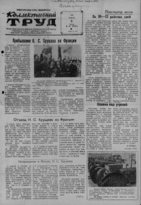 ПИШЕТАРИИ ВСЕХ СТРАН, С0ЕДИНЯИТЕ5Ы л - О ш ■ b$ f 40кЫ£МхТШШ£Ш Орган Карасукского райкома Коммунистической партии Советского Союза н районного Совета депутатов трудящихся Новосибирской области № I960 Апрель 6 Среда 43 (2693) ♦ Цена 10 коп. Навстречу весне За Ю ~12 рабочих дней Пребывание Н. С, Хрущева во Франции v 2 апреля— предпоследний день пребывания Н. С. Хрущева во Франции. Он начался с посещения Версаля, где советские гости ознакомились с Дворцом и парком. Главу Советского правительства сопровождали государственные министры Франции Андрэ Мальро и Роже Фрэ. После осмотра Версальского дворца и парка глава Советского правительства Н. Q. Хрущев направился в Рамбуйе, где во второй половине дня возобновятся переговоры между Председателем Совета Министров СССР и Президентом Французской Республики. * * * 2 апреля Председатель Совета Министров СССР Н.С. Хрущев, находившийся с государственным визитом !во Франции, устроил пресс- конференцию. Свыше 800 журналистов, представляющих мировую печать, телевидение, радио, а также приглашенные лица собрались в зале ,,Патенотр“ в Рамбуйе задолго до начала пресс-конференции. Появление в зале Н. С. Хрущева было встречено бурными аплодисментами. Но снимке: порилсане приветствуют Л. С. Хрущева у его резиденции на набережной h';>д'Орсэ. Фото специального фотокорреспондента ТАСС В. Сова* лева. (Снимок принят по фототелеграфу). Пресс-конференция передавалась по радио и телевидению по всей Франции и за ее пределами. В своем кратком заявлении Н. С. Хрущев выразил удовлетворение переговорами с Президентом Французской Республики де Голлем и членами французского правительства. Затем Н.С.Хрущев ответил на вопросы журналистов. В тот же день вечером Председатель Совета Министров СССР Н.С.Хрущев выступил по французскому телевидению. Одновременно выступление Н. С. Хрущева передавалось телевизионной сетью 12 стран: Дании, Норвегии, Швеции, Англии, Бельгии» Голландии, Западной Германии, Италии, Швейцарии, Югославии и других. Во втором году семилетки хлеборобы шестой бригады , (Колхоза ,40 лет Октября" ;решилн вырастить на каждом гектаре зерновых не лменее (2 ц хлеба. Это в два раза больше, чем'было получено в прошлом году. Сев—самый серьезный этап в борьбе за получение высокого урожая. Недаром говорят: „Чго посеешь, то и .пожнешь". Поэтому наши механизаторы и полеводы готовятся в сжатые сроки и .на высоком агротехническом уровне провести все весен- .ние полевые работы. К проведению сева Ш подготовились неплохо. 5 тракторов различных.’марок, 9 зерновых сеялок, 5 плугов и другой 'сельскохозяйственный инвентарь отремонтировали надежно и думаем в работе они не под- Iведут-. За каждым трактором закреплено по два водителя. Сейчас механизаторы оказывают помощь животноводам в проведении зимовки скота. Р. Шмидт и Я. Шмидт подвозят корма. И. Сапров- ский трудится чабаном и добросовестно выполняет возложенные на него обязанности. И. Якоб работает грузчиком на подвозке кормов. Р. Роппель скотник и одновременно машинист движка на водокачке. Гордимся мы своими механизаторскими кадрами, все ойй не только опытные специалисты, но и трудолюбивые животноводы. Большие надежды возлагаем на них в период весеннего сева—на их плечи ляжет выполнение основных видов работ. Своевременно побеспокоились полеводы о Семенах. Кроме кукурузы и ячменя, посев кото