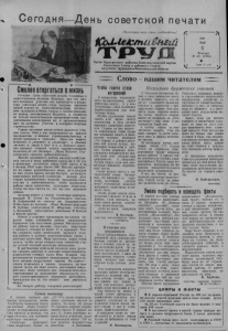 Сегодня—День советской печати ё= Смелеевторгатьсявжизнь Сегодня—День советской печати. Созданная и вынестовапная великим Лениным, при его лич- иои активном участии как публициста и редактора советская печать стала могучим оружием нашей партии но коммунистическому воспитанию трудящихся.Наши газеты с честью выполняют задачу, поставленную Ильичом, и являются не только коллективными пропагандистами, коллективными агитаторами, но и организаторами масс на активное участие в коммунистическом строительстве. Самым массовым видом иочати являются стенные газеты. Они у нас выпускаются на каждом предприятии, в каждом учреждении,бригаде и фгрме колхозов и совхозов. Здесь вы можете встретить и „молнии“, и „колючки", и „боевые листки", и ..вилы в бок“ и т. д. Большое значение придают стенной печати парторганизации колхозов„40 лет Октября-, „Маяк Ильича", Сту- деновского совхоза, райпотребсоюза. Многие трудящиеся района находят необходимым нисатьв нашу районную газету.За 1*59 год в редакцию поступило около 1500 писем, а за 4 месяца 1900 года—более 500. Письма поступают на самые разнообразные темы, по в каждом из них видна забота автора быстрее достигнуть намоченных рубежей семилетки, больше дать стране промышленных изделий, продуктов полеводства и животноводства, чтобы трудящиеся района жили зажиточно, культурно отдыхали, чтобы быстрее смести то, что мы еще называем дрянью. Активно пишут в газету секретари парторганизаций Н. Агеев из Студеповского совхоза, Ф. Бобровский из совхоза им. Дзержинского, И Нестеров из колхоза „Маяк Ильича",нарсудья М. Бублик, учительница К. Збарская, счетовод А.Должиков, председатель рабочкома М. Ковтун и мпогие другие. Сейчас у сельских тружеников наступила горячая пора: хлеборобы района закладывают фундамент для получения урожая. Обязательства но району взяты высокие—получить вкруговую с каждого гектара не мепее 12 ц зерновых. Чтобы сдержать слово, необходимо провести нолевые работы в лучшие агротехнические сроки, с высоким качеством. Надо поставить перед собой задачу, чтобы весна второго года семилетки стала весной высокой культуры земледелия. В достижении зтой цели большую роль долж- пы сыграть рабочие и сельские корреспонденты, редколлегии стенпых газет. Ведь недаром корреспондентов называют командирами общественного мнения, подручными партии. Их задача— смелее вторгаться в жизнь, подымать на щит героев труда, их опыт делать достоянием широких масс, шире освещать ход социалистического соревнования за выполнение обязательств, острым словом критиковать нерадивых работников, бракоделов, все то, что мешает нам двигаться вперед. За боевую работу, товарвщн рабселькоры! 'jV N ^ A A A A / W V V V V V V V V W V W V V V V W V W V V V V W V V V V V V V W V V V V V V V W V W V W W W Пролетарии всех стран, соединяйтесь! %ЪМШ&ги Т Р Орган Карасукского райкома Коммунистической партии Советскою Союза и районного Совета депутаток трудящихся Новосибирской области 1960 Май 5 Четверг Л» 55 (2705) ❖ Цена 15 коп Слово —нашим читателям Сеют пшеницу В теплые майские дни „ДТ 54“с тремя широкоряд- быстро прогревается почва, ными сеялками выехал на Хлеборобы четвертой брига- полосу. За смену он засеял ды колхоза „Маяк Ильича1* 49 гектаров хорошо обрабо- еледят за созреванием земли, тайной пашни. В первый же Они пришли к выводу, что день И. Зенин перекрыл за- j- пора начинать сев ос