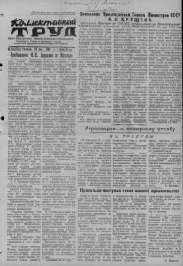 • t 20 пая 1960 года, № 62 КОЛЛЕКТИВНЫЙ ТРУД 3 л . ПребаыниевН. С.. Хрущева во Франции (Окончание. Начало на 1стр.) Во второй половине двя- 17 мая Председатель Совета Министров СССР Н. С. Хрущев принял в своей резиденции в советском посольстве в Париже депутата Национального собрания Франции, мэра города Дижона каноника Феликса Кира. Никита Сергеевич Хрущев вышел во двор посольства, чтобы встретить Кира. Н. С. Хрущев и Феликс Кир сердечно' обнялись и расцеловались. Затем между ними состоялась теплая беседа.(ТАСС) Пресс-конференция Н. С. Хрущева в Париже 18 мая во второй половине дня Председатель Совета Министров СССР Н. С. Хрущев устроил в Париже пресс - конференцию для журналистов, съехавшихся во Францию для освещения совещания на высшем уровне. Пресс - конференцию от- крыл министр иностранных дел СССР А. А. Громыко, предоставивший слово Пред седателю Совета Министров СССР Н. С. Хрущеву, который в 1 7 -0 0 по московскому времени выступил с заявлением. После оглашения заявления глава Советского правительства ответил на вопросы представителей печати. Пресс-конференция продолжалась около двух с половиной часов. (ТАСС). Завершать посев зерновых, полным ходом сеять кукурузу и садить картофель! Приглашение Н. С. Хрущеву посетить Берлин У БЕРЛИН, 17 мая (ТАСС). Агентство АДН передало следующге сообщение: Правительство ГДР пригласило Председателя Совета Министров СССР Н. С. Хрущева по пути из Пар и- жя посетить Германскую Демократическую Республику. 17 мая в беседе с журналистами Н. С. Хрущев заявил в Париже, что он во вре мя своего возвращения в Москву остановится в Берлине с тем, чтобы встретиться со своими друзьями Вальтером Ульбрихтом, Отто Гротеволем и другими. Одвижении советского космического норабля-спугника На 18 часов московского времени 17 мая с. г. корабль-спутник совершил 43 оборота вокруг Земли. Вся бортовая аппаратура . корабля-спутника продолжает нормально функционировать По командам, передаваемым с Земли, производится опробование различных приборов, установленных на борту корабля. Соответствующие системы регулирования поддерживают в отделяемой кабине условия, необходимые для нормальной жизнедеятельности человека. Полученная телеметрическая информация о работе приборов и систем, установленных на корабле-спутнике, обрабатывается и изучается. Наземные радиотехнические станции автоматического измерительного комплекса продолжают вести наблюдения за движением корабля-спутника. (ТАСС). По 30 га за смену 4 дня назад к большому массиву хорошо обработанного поля четвертой бригады колхоза «Маяк Ильича» подошел агрегат Виктора Надолинного. За рулем трактора Дмитрий Нечитайло. Друзья по полюбившемуся делу вновь взялись за сев кукурузы. В прошлом году не удалась кукуруза: мало удобрили землю, не вполне хорошо обработали посевы. Нынче кукурузоводы решили получить с "каждого гектара не менее 300 ц зеленой массы. Зимой они Удобрили участок перегноем, весной задержали талые воды, тщательно обработали поле. И вот заработали машины, защелкали узлы мерной проволоки. Спервых дней по 25—30. гектаров ежедневно засевает агрегат В. Надолинного. Не погоня ли это за количеством гектаров, пoлvчaтcя ли квадраты? На это Виктор Надоливный отвечает: —Могу поручиться, квадраты будут отличные, а менчпе, чем по две нормы мы давать не согласны. И. Кестеров. кукурузу сеет А
