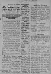 *yl г o f Vi . $ь ^ куи ^ л ^ о У^й2^С_. Пролетарии всех стра,н соединяйтесь 7 Орган Карасукского райкома Коммунистической партии Советского Союза и районного Совета депутатов трудящихся Новосибирской области №79 (2729) 13реда, 29 июня 1906 г IЦзна 15 коп. Научно-практические конференции На днях в колхозе «Маяк Ильича» состоялась научно-практическая конференция. Такие конференции скоро будут проведены и в других хозяйствах. Они призваны выявить резервы дальнейшего увеличения производства животноводческой продукции. Чтобы конференции достигли своей цели, к ним надо готовиться, как к весьма серьезному делу. На партийном собрании или заседании бюро надо утвердить план подготовки и проведения, детализировать его па расширенном заседании правления. Затем разъяснять всем колхозникам цель и значение -конференции, про будить в них творческую мысль, тщательно изучить опыт в' своем хозяйстве, использовать хороший опыт других. Неплохо на всех фермах в порядке подготовки провести собрания колхозников, послать свои делегации в другие хозяйства, чтобы перенять передовой опыт. Важно добиться, чтобы сама подготовка к конференции уже способствовала дальнейшему подъему общественного животноводства. Чтобы яснее было видно колхозникам, как развивается общественное животноводство,надо изобразить наглядно диаграммами и таблицами рост производства продуктов животноводства за прошедшие 5— .7 лет и планы на ближайшее семилетие. На конференции в Маяке Ильича были делегации из некоторых колхозов и совхозов, чтобы поучиться готовить и проводить их, учесть плюсы и мьмусы этой конференции. К сожалению, не все хозяйства послали своих представителей. Несколько замечаний о недостатках конференции. Во-первых, на ней мало присутствовало колхозников и особенно работников животноводства. Во-вторых, многие доклады носили слишком теоретический характер, мало касались жизни данного хозяйства. Таким был доклад гл. зоотехника райсельхозинснекцип т. Дедюхина, отчасти и директора станции но племенной работе т. Арамцо- ва. Было бы лучше, если с помощью этих товарищей 'доклады на эти темы подготовили специалисты колхоза. Сверх всякого ожидания сугубо теоретическим оказался доклад механика колхоза т.' Анайко. Он говорил о механизации трудоемких процессов в животноводстве, по ни словом не обмолвился, как с этим делом обстоит в колхозе. Конечно, мало проку от такого доклада. Были недостатки и в ведущем докладе председателя колхоза т. Барило. Он слишком изобиловал цифрами. Конечно, говоря об экономике, не обойтись без цифр. Но вокруг них нужны уместные рассуждения, показывать их лучше в сравнении, а не простым перечислением. Надо надеяться, что эти недостатки первой конфе- )енцпи будут учтены в других хозяйствах, и научно-практические конференции пройдут лучше. На ферме мягкого золота Возвращениеиз Бухареста делегации Коммунистической партии Советского Союза 27 июня в Москву из Бухареста возвратилась выезжавшая на III съезд Румынской рабочей партии делегация Коммунистической партии Советского Союза во главе с членом Президиума Центрального Ко ми т е т а КПСС. Первым секретарем ЦК КПСС К. С. Хру- » щевым. (ТАСС). Осмотр руководителями Коммунистической партии и Советского правительства новой авиационной технини 27 июня на Внуковском аэродроме товарищи А.Б.Аристов, Л.И.Бреж- нев,Н