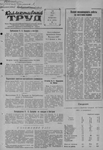 10 июля 1960 года, № 84 КОЛЛЕКТИВНЫЙ ТРУД 3 Читайте „Сельскую жизнь" С 17 апреля вместо газеты „Сельское хозяйство1*, бывшей органом Министерства сельского хозяйства СССР, выходит газета ЦК КПСС„Сельская жизнь1. Новая газета рассчитана на самые широкие круги сельских жителей. Много интересного для себя в ней могу т найти руководители и специалисты хозяйств, партийные ' работники и активисты,сельская интеллигенция, рядовые колхозники и рабочие совхозов, физкультурники, охотники, рыболовы, сельская молодежь и детвора. Об опыте передовых хозяйств, бригад и людей га зета рассказывает на своих сменных зональных страницах и на страницах -плакатах. Сибиряки с несомненным интересом прочитали такие страницы, как „Каждый из них производит в час центнер свинины1, „Иван Малашенко—чабан-новатор“, „И на целине кукуруза приносит изобилие “, „25 коров на сто гектаров1 и другие. Опытом руководства крупными многоотраслевыми хозяйствам]! поделились на страницах газеты дважды Герой Социалистического Труда председатель колхоза имени Сталина Луховицкого района Московской области Ф. Генералов, председатель колхоза „Путь Ленит. н а1 Буйекого района Костромской области П. Арахин, председатель колхоза ‘„Молодая гвардия1 Ионишского района Литовской ССР А. Маникас. Досрочно Включившись в соревнование за достойную встречу Пленума ЦК КПСС, коллективы жирового и колбасного цехов Карасукского мясокомбината обещали к 15 июля завершить производственную программу семи месяцев. Свое слово они сдержали, выполнив обязательство на неделю раньше срока. Особенно больших успехов в труде добились мастер жирового цеха Людмила Сиверен- чук, рабочая Анна Лисина, мастера колбасного цеха Надежда Громыко, Вера Рубан, Кеенья Васильева и Петр Фи- ленков. Их ежесменная выработка —150 процентов и выше. И. Бурдаев. Крупнейшая в мире электрифицированная магистраль % Это будет самая большая электрифицированная магистраль в мире. От Москвы она пойдет на восток по территории Урала и Сибири до берегов Б айкала.Протяженность ее более пяти тысяч километров. 7 июля коллегия Министерства путей сообщения рассмотрела вопрос о том, как идут работы на крупнейшей стройке семилетки. Здесь уже электрифицировано около четырех тысяч километров. Строителям осталось сдать ещо около тысячи километров на Красноярской и Восточно- Сибирской магистралях, где впервые в стране железные дороги электрифицируются на переменном токе. Завершаются работы на участках Инза— Рузаевка и Рузаевка—Сасово. С их пуском электровозы станут курсировать от Москвы до Кургана. На участках Мариинск—Чер- нореченская и Клюквенная— Тайшет завершаются работы по прокладке контактной сети и строительству тяговых подстанций, которые будут иметь дистанционное управление. Строительство крупнейшей в мире электрифицированной магистрали завершится в конце года. (ТАСС), Газета проводит обсуждение наиболее, животрепещущих проблем развития сельского хозяйства и руководства им.Большой поток писем, значительная часть которых опубликована, вызвал статьи секретаря Володарского райкома КП Украины А. Волынца „Не канцелярия, а штаб производства" (мысли о районной инспекции по сельскому хозяйству), а также академика Е. Мацепуро „Как лучше организовать конструирование машин1. Систематически печатаются в газете материал