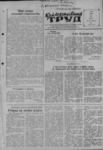 Шире размах колхозного строительства Из года в год растут темпы строительства в колхозах и совхозах района. Так, в 1959 году находились в строительстве 62 животноводческих, хозяйственно-производственных и культурно-бытовых помещения. Только в колхозах было построено 295 жилых домов. Большой план строительства намечен и на 1960 год. Надо построить 35 животноводческих, 16 производственных, 7 культурно-бытовых зданий и 300 жилых домов колхозников и сельской интеллигенции. Д ля того чтобы выполнить такой объем работ, нужно приложить много сил и энергии. Примером заботливого, хозяйского отношения к строительству служат руководители колхозов „Маяк Ильича", „Новая семья“ и им. Тельмана Готовиться к строительству они начали еще с зимы. В этих хозяйствах находит широкое применение местный строительный материал. Так, в колхозе „Новая семья“ основным строительным материалом является камыш. За осенне-зимний период артель заготовила 1100 кубометров леса. Добротные типовые помещения строят колхозы „Маяк Ильича" и им. Тельмана. Однако имеются факты, когда в отдельных колхозах строительство пущено на самотек. В колхозах „Вперед к коммунизму", им. Жданова не используют местный строительный материал, несерьезно отнеслись и к заготовкам деловой древесины. В колхозе „40 лет Октября" больше десяти построек осталось переходящим строительством на 1960 год. Вредная практика распыления средств и материалов на большое количество объектов приводит к тому, что строительство растягивается на долгие годы и нередко отдельные конструкции выходят из строя, не дождавшись сдачи в эксплуатацию. С этим пора решительно покончить. Руководители сельхозартелей „40 лет Октября", им. Жданова, „Вперед к коммунизму" строительство ведут наемными людьми, ссылаясь на нехватку рабочей силы. Этот довод лишен всякого основания. В хозяйствах есть возможность со з- да/пь постоянные бригады, привлечь на стройки все трудоспособное население, не занятое на других работах. Посильную помощь могут оказать и живот поводы. Сейчас наступил наиболее благоприятный период для строительства и ремонта помещений. И если приложить все силы, намеченный план будет успешно выполнен. \ллМ . (ZJfCUlAi Пролетарии всех стран, соединяйтесь! 4С й ^ Ш ы п и £ * т й T T P V f l Готовимся к уборке На полях восьмой бригады ляются с работой комбайнеры артели «40 лет1 Октября» Александр Шель, Петр Шара- зреет, богатый урожай. Зара- вин, Виктор Дуквин. Из пяти нее беспокоятся механизаторы о подготовке хлебоуборочной техники. Ремонт комбайнов ведется в центральной мастерской. Успешна справкомбайнов уже отремонтировано три. Готовы к работе два лафета. В. Перелетов, бригадир. Орган Карасукского райкома Коммуни! тической партии Советского Союза и районною Совета депутатов трудящихся Новосибирской области I960 Июль 15 Среда Л*. 85 (2735) ★ Цена 15 коп. Посевы — п о д н о н т р о л е и Задень 70 центнеров оена Благоприятные погодные условия способствуют хоро- Опустела колхозная кон- шему росту кукурузы. От тора.Висят замки на дверях ухода теперь зависит уро- ктадовых. В селе не встречай королевы полей. тишь прохожего. В этот конных бричках. Механизаторы артели име- день все работники управ- ни Тельмана Петр Лоренц, ленческого аппарата,подсоб- Алсксандр Амарцев, Вик- ных хозяйств колхоза име- тор Лесков и Александр ни Куйбышева вышли на „ „ Ни