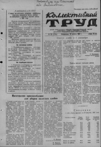 C ju . (^и^ослллл-Кгл-'кзе^ s В райисполкоме и РК КПСС О мерах материального поощрения комбайновых агрегатов, машинистов жаток, занятых на хлебоуборке в колхозах и совхозах района в 1960 году В целях своевременной и качественной уборки урожая, бюро РК КПСС и исполком райсовета депутатов трудящихся постановляют: Рекомендовать колхозам и совхозам района установить лучшим комбайновым агрегатам, комбайнерам и машинистам жаток но три денежных премии на косовице хлебов и подборке валков: первая премия—500 руб., вторая —400, третья —300 рублей. Денежные премии выдаются при условии, если за 7 рабочих дней при хорошем качестве работ сделано: На косовице хлебов 1. Комбайновому агрегату, состоящему из сцепа двух комбайнов или комбайна с жаткой, скосившему 310 га. 2- Агрегату, состоящему из сцепок трех жаток,—400 га. 3. Агрегату, состоящему из сцепок двух жаток, скосившему 310 гектаров. 4. При косовице одним комбайном или одной жаткой—175 га. На подборке валков 1. Агрегату, состоящему из сцепа двух комбайнов, при подборке 300 га2. Агрегату, состоящему из одного прицепного комбайна,— 170 га. 3. На комбайне „СК-3“—175 га. Первая премия вручается комбайновым агрегатам добившимся высшей выработки, вторая и третья—соответственно за следующие показатели, но не ниже установленного задания. Бюро РК КПСС и исполком райсовета объявляют фестиваль на право первой подписи колхозом, совхозом, бригадой колхоза, фермой,отделением Совхоза рапорта обкому КПСС и облисполкому, первыми закончившими косовицу и обмолот хлебов в районе. Пролетарий всех стран£ соединяйтесь? ОРГЯН КЯРЯСУКСКОГО РАЙКОМА к омм у н и с т и ч е с к о й: пя р тии СОВЕТСКОГО СОЮЗА И РАЙОННОГО СОВЕТА ДЕПУТАТОВ ТРУДЯЩИХСЯ НОВОСИБИРСКОЙ ОБЛАСТИ f ЩнзИГ КОП, Т 1 Г Ш Воскресенье, 23 августаНШ Г гГ г Скосим хлеба % 5 сентября Полным ходом идет жат- виях ненастной погоды они ший агрегат из лафетных ва на полях артели „Впе- свалили 59 гектаров пше- жаток. пед к коммунизму11. Скоше- ницы. Хлеборобы артели, йены рыжик, овес и ячмень. и смотря на ненастную погоМеханизаторн ведут косо- Тракторист на „Беларуси д у , стремятся свалить все вицу основной продоголь- Н. Трушин и лафетчик хлеба в валки не позднее ственной культуры— пшени- И. Царев пятидневное за- 5 сентября и отправить в цы Около 1200 гектаров дание выполнили на 230 про- государственные закрома зерновых уложено в валки, центов. Они ежедневно ска- около 24 тысяч центнеров, что составляет более 30 пре- шивагот по 30— 32 га. Им хлеба. центов уборочной площади, „пучен кпасный вымпел и ономар в Г лмтвоенной энергией ВР 5чен красный вымпел И секретарь парторгаштчи* С удвоенно £ денежная премия. Это луч- колхоза, трудятся на полях механи- « г заторы и полеводы, работа- , , т ют с полной отдачей сил. Агрегат комбайнера Г. Гаврюшенко и тракториста З д е С Ь КОСЯТ ТО Л Ь К О Д Н вМ Н. Сарапулова ежедневно А скащивает в юлки до 25 гек- _ е д я т с я механиза- тракторах. Часть проводки нопме °П ятидневное дание торы пятой бригады колхоза сожгли зимой при подогрева- Г ^ п Г н Г Г ^ п р о - «Маяк Ильича». Одновременно центов. На агрегате разве- „ . вается переходящий крас- бождают поля ный вымпел. За самоотвер- гт" тт" тт " " 1 уборкой хлебов они осво- Много проводов пропало вес ««адают поля от соломы и ной при перестановке с ком пашут зябь. Около 200 гек- байновна сеялки. ж еннТю " работу Т Гаврю- таров вспахали Иван Цыберкин, .