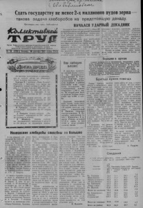Сдатьгосударству не менее2-х миллионов пудовзерна такова задача хлеборобов на предстоящую декаду. НАЧАЛСЯ УДАРНЫЙ ДЕКАДНИК Пролетарии веех стран, соединяйтесьt 4C iKU £jcm u&H 6ai Орган Карасукского райкома Коммунистической партии Советского Союза и районного Совета депутатов трудящихся Новосибирской области № 113 (2763)| Пятница, 16 сентября 1960 г.lTjml!)KM. Решением бюро обкома КПСС с 15по 2.5 сентября объявлен ударный декадник по быстрейшему завершению уборки урожая, резкому усилению обмолота валков и хлебозаготовок. В период декадыi нам необходимо засыпать в закрома Родины не менее двух миллионов пудов зерна , завершить уборку кукурузы, широким фронтом вести копку картофеля, усиленно сволакивать солому с полей и без промедления пахать зябь. Товарищи механизаторы, шоферы, возчики зерна, работники на токах и приемных пунктах, горожане, работающие в колхозах и совхозах, студенты и школьники, специалисты сельского хозяйства, плены семей колхозников и рабочих совхозох—все, кто трудится в эти дни на полях! Родина ждет от каждого из вас героических усилий, трудовых подвигов на хлебном фронте. _ Все, кому дорога честь нашего района, выходите на ударный декадник, покажите, на что способны, карасучане! Честь и слава тем, кто пока жет себя героем великой битвы за хлеб! За высокие показатели в соревновании за август месяц на районную Доску почета заносятся: Бригада № 4 колхоза „Маяк Ильича* (бригадир А. Бальцер), где надои на фуражную корову составили по 256 литров, а с начала года по 1.998 литров. Бригада № 11 колхоза „40 лет Октября* (бригадир А. Сиволап). В августе получено молока по 287 литров на корову. А. Исаева, доярка колхоза, „40 лет Октябрянадоившая в августе по 379 литров молока на корову. И. Сухина. доярка колхоза „40 лет Октября", надоившая по 372 литра. Н Губа ревя, доярка колхоза „40 лет Октября*, надоившая по 337 литров молока. Л. Попадюв, доярка колхоза „Маяк Ильича", надоившая по 300 литров на фуражную корову. М. Шнайдер, доярка совхоза им. Дзержинского, надоившая в августе по 325 литров на фуражную корову. Плен хлебосдачи * выполнен! 14 сентября труженн-| ки третьей фермы совхоза им. Дзержинского (управляющий М. Иино- марев, секретарь парторганизации X. Писков ! цева) первыми в районе выполнили план сдачи хлеба государству. На хлебоприемные пункты отправлено 5.100 ц зерна. На второй день было отгружено Родине сверх плана еще 3.000 ц хлеба. Досрочно выполнили план сдачи хлеба государству рабочие четвертой фермы этого же совхоза (управляющий М. Пинигин, секретарь парторганизации В. Ко- дупайло, заведующая током т. Муравьева). В закрома Родины засыпано 8.200 ц зерна, из них 3.000 ц сверх установленного плана. Ивановские хлеборобы способны на большее В эти страдные дни умело трудятся на хлебном фронте многие механизаторы и полеводы села Ивановки, где расположена 8-я ферма совхоза им. Дзержинского. Им помогают горожане. Замечательно трудится Ф. Семенихин.кото- рый сейчас водит комбайн «СК-3». Он уже подобрал и обмолотил около 250 гектаров хлебов.Не отстает отнего его воспитанник А. Аник. Он соревнуется со своим учителем и даже иногда обгоняет его. Хорошо работают на ^жатках Егор Майер, Андрей Гидион и на переоборудованном комбайне «С-6» Л. Минаков. А с каким старанием отгружа ет зерно от комбайнов на самосвале шоферавтохозяйства Ф. Лавров! В день на расстояние 8—10 километров он доставляе