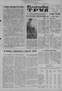 л v * ( z J 6UUU JhU SL f / J & § u $ и $ и и л х> о £c^csl^ Пролетарии всех странt соединяйтесь? Скоро праздник Октября f Приближается славный праздник советских людей—43-я годовщина Великого Октября. Трудящиеся района встают в эти дни на предоктябрьс к ую трудовую вахту, чтобы встретить знаменательную дату достойными трудовыми подарками. Колхозники и рабочие совхозов продолжают битву за хлеб.В районе хлеба еще не убраны более чем с 20 тыс. га.Надо приложить все усилия.чтобы в ближайшие 2—3 дня закончить подборку и обмолот валков. Сверх плана государству отправлено 276.630 пудов зерна. Дело' чести хлеборобов района— засыпать в фонд мира миллион пудов зерна сверх задания. Наряду с уборкой зерновых и хлебосдачей надо активней вести засыпку семян, пахать зябь под урожай будущего года. Сейчас во многих хо зяйствах трактора высвобождаются с уборки урожая, их надо производительно использовать на вспашке зяби. Пахота должна вестись днем и ночью. Каждой бригаде, трактористу довести конкретные задания и строго контролировать их. Не терпит отлагательства копка картофеля. Пока стоят погожие дни, его надо выкопать, перебрать и засыпать в надежные хранилища. В большом дол гу перед государством животноводы. Д л я них лучшим подарком празднику бу дет полный расчет с государством шо всем видам продуктов животноводства. Такие возможности есть, их надо использовать. Чтобы зима не застала врасплох, надо по хозяйски подготовиться к ней: хорошо отремонтировать животноводческие помещения, механизировать доение и поение, подвезти к фермам все корма. Большие задачи стоят перед рабочими и служащими промышленных предприятий и у ч реждений. Надо хорошо подготовить предприятия к работе в зимних условиях, чтобы в связи с переходом на семичасовой рабочий день производительность труда не снизилась, а повысилась, создать рабочим нормальные бытовые условия для высокопроизводительного труда. До праздника Великого О ктября остался месяц. Ш ире развернем предоктябрьское социалистическое соревнование за достойную встречу этой знаменательной даты! Орган Карасуиского райкома Коммунистической партии Советского Союза и районного Совета депутатов трудящихся Новосибирской области №121 (2771)1 Среда, 5 оитября 1960 г. I Цена 15 коп' На 4 октября колхозы и совхозы района сдали государству 3 МЛН, 776.630 пудов зерна Вот это водители! Успех уборки урожая во многом зависит от быстрей и организованной транс портировки зерна. Поэтому сейчас на вывозке хлеба г о сударству принимает учас тие весь автотранспорт района. Замечательные образцы труда показывают шоферы СМ У .Запсибхлебостроя'1 братья Иван и Павел Степа- нюк. Днем они заняты на вывозке строительных материалов на предприятии. После окончания работы братья не ставят машины на прикол, а отправляются в рейс за зерном. 1 октября за одни сутки Иван вывез с тока 15 бри га ды колхоза .40 лет Октября “ 387, а Павел 229 центнеров хлеба. А 4 октября Павел доставил из Несте- ровки 300 центнеров, а Иван —250. —Вот это водители!—отзываются о них колхозники . С уважением относятся к ним и свои рабочие. В. Сухина. Урожай убран Хороши хлеба в к'олхозе „Заветы Ленина'1 Шадринско- го района Курганской области. Хлеборобы ежегодно снимают высокие урожаи. Это—результат внедрения системы обработки почвы предложенной колхозным ученым Т С. Мальцевым—директором Шадринской го