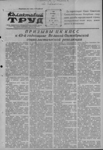 'i. LCt^vt<A‘ ; ij d 'ffu . J I tS u lt-oO ъХ^ЛОЛ СД l l u t tX + / iSU l Пролетарий всех стран, соединяйтесь) f&KUekxms$M6ai Орган Карасунского райкома Коммунистической партии Советского Союза и районного Совета депутатов трудящихся Новосибирской области 1960 Октябрь 19 Среда № 127 (2777) ★ Цена 15 коп. У Да здравствует Союз Советских Социалистических Республик—твердыня дружбы народов нашей страны, несокрушимый оплот мира, демократии и социализма! П Р И З Ы В Ы ЦК К ПС С к 43-й годовщине Великой Октябрьской социалистической революции 1. Да здравствует 43-я годовщина Великой Октябрьской социалистической революции! 2. Слава Великому Октябрю, открывшему новую эру в истории человечества—эру крушения капитализма и торжества социализма! 3. Да здравствует марксизм-ленинизм— победоносное знамя Великой Октябрьской социалистической революции, могучее идейное оружие трудящихся ■всех стран! 4. Трудящиеся Советского Союза! Все силы на выполнение всемирно-исторических решений X X I съезда партии, великих задач развернутого строительства коммунизма в нашей стране! 5. ' Пламенный привет братским коммунистическим и рабочим партиям— авангарду рабочего * класса и всех трудящихся в борьбе за мир, национальную независимость народов, за демократию и социализм! Да здравствует нерушимое единство и сплоченность коммунистических и рабочих партий всех стран! 6. Пролетарии всех стран, соединяйтесь! • 7. Пусть крепнет единство действий, боевая солидарность рабочего класса и трудящихся всех стран в борьбе за мир и демократию, за свободу и независимость народов, за социализм! 8. Выше знамя пролетарского интернационализма! 9. Братский привет всем народам, борющимся за полное уничтожение позорной системы колониализма! Народы мира! Добивайтесь немедленного предоставления полной независимости и свободы всем колониальным странам! 10. Народы всех стран! Боритесь за мир, за всеобщее и полное разоружение! Решительно разоблачайте империалистических поджигателей войны —врагов человечества! 11. Народы мира! Добивайтесь ликвидации „холодной войны“ и смягчения международной напряженности! Добивайтесь прекращения испытаний и запрещения атомного и водородного оружия! 12. Народы всех стран! Решительно выступайте против вооружения Западной Германии, против оснащения немецких реваншистов ракетно атомным оружием, за заключение мирного договора с Германией и ликвидацию оккупационного режима в Западном Берлине! 13. Горячий привет мужественным борцам за мир, демократию, социализм и национальную независимость, томящимся в тюрьмах капиталистических стран! 14. Да здравствует могучая мировая система социализма—несокрушимый оплот мира и безопасности народов! Пусть процветает и крешфт великое содружество стран социалистического лагеря! 15. Бр Деки# привет трудящимся Китайской Народной Республики, строящим социализм! Да здравствует вечная, нерушимая дружба и сотрудничество между великими народами СССР и Китая! 16. Братский привет трудящимся Народной Республики Албании, строящим социализм! Да здравствует вечная, нерушимая дружба и сотрудничество между советским и албанским народами! 17. Братский привет трудящимся Народной Республики Болгарии, строящим социализм! Да здравствует вечная, нерушимая дружба и сотрудничество между советским и болгарским народами! 18. Братский привет трудящимся Венгерской Наро