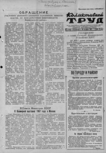 . J ( j J l j u d & С с {1Г /•£ - ■*, IS. С l <Ц 0 ^ / 'XU^Q *) VUAsfcHL,J ' / Пролетарий всех стран, соединяйтесьJ О Б Р А Щ Е Н И Е участников районного совещания передовиков животноводства, ко всем работникам животноводства Карасукского района Дорогие товарищи! Мы. участники районного совещания, подведя итоги проделанной работы за три квартала 1960 года работниками животноводства, отмечаем, что благодаря нашему с вами труду имеются определенные успехи в подъеме общественного животноводства, его продуктивности, в выполнении взятых социалистических обязательств по продаже государству продуктов животноводства. Мы вправе гордиться, что нашему району за выполнение 9-месячног*> плана по продаже мяса на 115,4 проц., молока на 103,7 проц., яиц на 100 проц. вручено переходящее красное знамя обкома КПСС и облисполкома по зоне Кулундинских районов. В районе имеется много животноводов, которые успешно выполняют свои обязательства. Работники животноводства колхоза имени Жданова выполнили план продажи за 9 месяцев мяса на 112 проц., яиц на 122 проц. Успешно справились с планом продажи государству мяса колхозы им.Тельмана и «Новая семья», молока—колхоз «Маяк Ильича». В районе из года в год растет валовое производство продуктов животноводства. Лучших показателей в этом добились животноводы колхоза «Новая семья».Выход продуктов животноводства в 1960 г. по сравнению с 1959 г. составил по мясу 200,6 проц., по молоку 1т2,8 проц., по шерсти 115,6 проц., по яйцу 106,5 проц. Сегодня мы вправе назвать имена лучших работников животноводства: из колхоза «Маяк Ильича» доярку Дридигер Елену Ивановну, надоившую за 9 месяцев по 2421 л молока от каждой фуражной коровы; Селезневу Валентину Ивановну, надоившую по 2286 литров; доярку колхоза «40 лет Октября» Вида Ксению Степановну, надоившую по 2203 литра; доярку Бейфус Эмму Кондратьевну, надоившую по 2236 литров, из совхоза имени Дзержинского; пастуха Студеновского совхоза Смирнова Николая Александровича, обеспечившего надой молока от фуражной коровы его гурта по 1900 литров; пастухов колхоза«40 лет Октября» Одинцова Петра Афанасьевича и Коваленко Григория Андреевича, обеспечивших надои по 1911 литров молока; телятницу Бабенко Анастасию Федоровну из колхоза «Вперед к коммунизму» и Зе- нину Елену Тихоновну из код- хоза«Маяк Ильича», сохранивших и вырастивших всех закрепленных за ними телят;ча- бана Логвина Григория Алексеевича из колхоза «40 лет Октября» и многих других. Успехи, достигнутые "в животноводстве, позволяют заявить, что в районе имеется полная возможность выполнить планы и обязательства по продаже государству продуктов животноводства. В то же время должны признать, что положение в животноводстве желает быть лучше. В результате плохого ухода, кормление и содержания в районе все еще низкая продуктивность скота, допущен большой отход животных. Сейчас наступает самое ответственное время. В оставшиеся 2 месяца этого года надо приложить все усилия, использовать все резервы, чтобы успешно выполнить задания и обязательства по продаже государству продуктов животноводства. Товарищи животноводы! Мы призываем Вас сосредоточить внимание на основных задачах, которые необходимо решить в ближайшие дни: 1. Необходимо сейчас же всех животных перевести на зимнее стойловое содержание и организовать кормление согласно рациона. Обратить особое внимание на размещение 