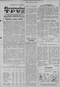 <fbCa-O A 3 ^ t rvjj*'******-* I и х ^ / ( ;ж ofucuj^u^ Пролетария всех стран, соединяйтесь1 4 G K U £ j f c n m $ m m Орган Карасукского райкома Коммунистической партии Советского Союза и районного Совета депутатов трудящихся Новосибирской области 134 (2784)“ Пятница, 4 ноября 1960 г. \ Цена 16 кспТ Пополнять запасы кормов ,Обилие кормов— главное условие для успешного? ^проведения зимовки скота. В текущем году колхозы и) )совхозы района лучше, чем в прошедшую зимовку, обе-? (спечили себя грубыми и сочными кормами. Более чем по; [12 ц сена на условную голову и по 11 тонн силоса на? корову запасли колхозники артели «Новая семья». В два (раза больше прошлогоднего имеется сена в колхозе? )им. Тельмана. В достатке обеспечили животных грубы-? >ми и сочными кормами в артели «Маяк Ильича». И все же в целом по району обеспеченность кормам и низкая. План накопления грубых кормов не выпол- >нен. Меньше других имеют сена колхозы им. Жданова,? «Вперед к коммунизму», им. Куйбышева. Здесь на условную голову имеется всего по 5— 7 центнеров. Только) )ПО 3 тонны на корову заложили силоса в колхозе име- )ни Куйбышева. Немногим более имеют силоса колхозы? ''«Вперед к коммунизму», «40 лет Октября», им. Ждано-? )ва и совхоз «Октябрь». Большим резервом для пополнения запаса кормов) (является солома. Но эти возможности многие хозяйства; >используют плохо. Даже по 2 ц соломы на условную голову не сумели припасти в колхозе «40 лет Октября»;? )И всего по 7,7 ц заготовили сена. Вправе спросить у ‘ )руководителей артели, чем же они думают зимой кормить скот? Плохо скирдуют солому" рабочие совхоза? '«Октябрь».По 3—4 ц соломы на условную голову заскирдовали в колхозах имени Куйбышева, им. Жданова, в сов-) (хозах им. Дзержинского и Студеновском. За последнюю декаду октября не заскирдовали ни? !одного центнера соломы в колхозах им. ЖдашЖ, имен )ни Тельмана, «Маяк Ильича»,«Новая семья» и в совхозе, ' «Октябрь». В некоторых колхозах,как, например, «40 лет? {Октября», «Вперед к коммунизму», им. Куйбышева и ' (совхозе «Октябрь» до сего времени лежит сено в копнах) )и валках. Сейчас необходимо взять на строгий учет все за-? (пасы кормов. По-хозяйски прибрать все сено и усилен-? [но вести сбор и скирдование соломы. Как можно больше? »сена и соломы надо подвезти к фермам. С первых дней зимовки нужно разумно расходо-? )вать имеющиеся запасы кормов. Не допускать такого< положения, когда к средине зимы животных переводят! )на голодный паек. Это происходит в тех хозяйствах,) ?где.корма расходуются бесконтрольно. Экономное расхо-' (дование кормов, разумеется, не означает сокращение ра-? (пиона. Бывает силоса в хозяйстве много, а траншеи за-( )крыты до весны, скот не докармливают, продуктивность) ?снижается. Важное значение в использовании кормов будет? (иметь кормоприготовление. Необходимо сейчас же поду-< [мать об измельчении и запаривании кормов, привести в) [готовность все имеющиеся для этого средства. С в е д е н и я о выполнении годового плана заготовок сельскохозяйственных продуктов за десять месяцев 1960 года (в проц.) Колхозы и совхозы Молоко Мясо Шерсть Яйцо Им. Тельмана 99,4 109,0 88,0 75,0 «Маяк Ильича» 114,0 97,0 75,0 25,0 «Вперед к коммун.» 101,0 84,0 57,0 73,0 *40 лет Октября» 79,0 75,0 79,0 36,0 Им. Куйбышева 82,0 99,6 89,0 60,0 «Новая семья» 90,0 113,0 63,0 59,0 Им. Жданова 96,0 112,0 72,0 122,0 Итого по колхозам 91,5 91,6 76,0 Г>! ,0 Им. Дзержинского 96.0 91,0 93.0 76,0 «Октябрь» 73,0 76,0 53,0 46,0 Студеновский 91,0 86,0 67,0 — Итого по совхозам 8 9 ,0 