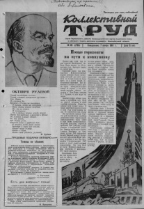 ^ /суй h jL&Q t<X J f / 0 <Kj. Oi^^XAcJXbJT Пролетарии всех стран, соединяйтесь^ ЛЛЛАЛЛЛ/V»< О К Т Я Б Р Я Р У Л Е В О Й Самый человечный человек, Самый главный коммунист ца свете— Это Ленин. Он ускорил бег Времени в России на столетья. И теперь, когда мы покоряем Реки, степи, космос голубой, Все мы имживем И повторяем: Он в сердцах живых всегда живой. Пусть бессмертный вмраморе и бронзе На зеленых улицах стоит. Он, как песня, Как живые розы, Навсегда вошел в рабочий быт. И сегодня, когда реет знамя Октября и мира над землей, Ленин—наше солнце, Ленин—с нами, Ленин—наш учитель, рулевой! Н. Дубков. «ТРУДОВЫЕ ПОДЛРКИ ОКТЯБРЮ Темпы не сбавим Рабочие завода стройматериалов в предоктябрьском соревновании взяли хорошие темпы в работе. Это позволило к 1 ноября 10-месячный план по товарной продукции выполнить на 106,4 процента. Все цехи справились с производственной программой, а некоторые—столярный, пилорама № 1 —значительно ее перекрыли. В связи с праздником приказом директора завода за хорошую работу отмечены 68 человек.47 рабочим вручены денежные премии, 9 человек занесены в заводскую „Книгу почета", 18—на Доску почета, 13 ра&очим объявлена благодарность, а восемь товарищей представлены к награждению Почетными грамотами райисполкома. Среди награжденных дизелист Н. Довбий, мас- тер-швен отличного качества М. Оберемок, плотник ft Констанц, слесарь М. Авраменко. Взятые темпы в работе коллектив завода решил не сбавлять и после праздника. А. Рогозный, секретарь парторганизации, 7 Есть два месячные плана! —Дадим в октябре два месячных плана,—таково было единодушное стремление коллектива рабочих и служащих райпищекомбината, когда он встал на трудовую вахту в честь великого праздника. Подведены итоги. Они говорят о напряженной борьбе в дни предпраздничного соревнования. Октябрьское задание по выпуску валовой продукции выполнено на 236 процентов. Особенно хороши результаты у рабочих смен, руководят которыми Н.Иль- чанина, Т. Деева, Р. Гринченко, Л. Свенторжицкая. Ниже стала себестоимость продукции, улучшилось её качество. Н. Придатко. 1CbUueJcmu6H€M Орган Карасукского райкома Коммунистической партии Советского Союза и районного Совета депутатов трудящихся Новосибирской области № 135 (2785) | Понедельник, 7 ноября 19В0 г. | Цена 15 коп. Новые горизонты на пути к коммунизму Прошел еще один год со дня славной Октябрьской победы. Наша страна за 43 советских года шагнула вперед на целые века. Советский народ под руководством Коммунистической партии успешно строит коммунизм, который для него является не только идеалом будущего, но и делом живой, повседневной практики. Все явственней встают в нашей жизни черты коммунистического завтра. В стране у нас положение хорошее,,, сказал, выступая в Нью-Йорке, товарищ Н. С. Хрущев, и дела идут чудесно. Замечательные победы одержаны в истекшем году. Одна за другой вступают в строй стройки семилетки. Новые доменные печи плавят чугун. В новых мартенах варится сталь: в этом году наши заводы дадут 65 миллионов тонн стали. На пустынных прежде берегах рек поднимаются стройные очертанияновых гидростанций. Прокладываются через тайгу и горы лини электропередач. Встречая праздник, строители Братской ГЭСдобились новых успехов в сооружении плотины. Экипажпортального крана Алексея Мещреина за одну смену уложил 590 кубометров бетона! Мировойрекорд! Вскоре молодой кр
