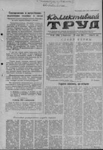 (л. t L & c t / с ^ С / 'ЯЦС-СосЗ-емиf / O^^Jlcoi^6 X < s C , 4 И. ОВЕЧКИН, гл. инженер, Я ЯСЯНИН, зав. РТМ, Н. ТОРОПОВ, Я. ПЯНЧЕНКО, бригадиры тракторных бригад, В. ЯЛИКОВ, тракторист. И. НЯЗЯ- РОВ, комбайнер. В райкоме КПСС и райисполкоме Бюро РК КПСС и исполком районного Совета депутатов трудящихся одобрили ценное начинание механизаторов совхоза „Октябрь", взявших на себя повышенные обязательства по ремонту техники в честь декабрьского Пленума ЦК КПСС, и призывают всех механизаторов района последовать их примеру. * Своевременно и качественно подготовим технику к весне Обращение механизаторов совхоза «Октябрь» ко всем механизаторам района Труженики совхоза „Октябрь" в этом году вовремя управились со всеми полевыми работами. До 5 сентября закончили уборку урожая. Государству сдано 50,5 тыс. центнеров зерна. Все это благодаря технике, благодаря умелому ее использованию механизаторами. Техника играет важнейшую роль в подъеме всех отраслей хозяйства. Поэтому ее подготовке уделяем особое значение. Идя навстречу декабрьскому Пленуму ЦК КПСС, мы по примеру купинских механизаторов включаемся в социалистическое соревнование и обязуемся к 20 декабря отремонтировать 31 трактор—60 процентов, половину комбайнов, 34 сенокосилки, 48 плугов, 65 сеялок, 18 граблей, 20 культиваторов и лущильников, 180 борон. У нас уже готово шесть тракторов, 26 сеялок, 13 плугов, 60 борон и один лущильник. Сделаем все возможное, чтобы к 15 февраля завершить ремонт всей техники, за исключением нескольких комбайнов. Ремонт ведем узловым методом, строго соблюдая при этом график и качество. Моторы обязательно проходят приработку. На ремонт поставлены лучшие механизаторы совхоза, которые со знанием дела ведут подготовку техники. За качеством следят бригадиры, а при приемке машин кроме них присутствуют тракторист, механик и инженер. Механизаторскими кадрами соеыоз обеспечен полностью. Почти все механизаторы сейчас изучают экономику сельского хозяйства, посещая кружки политпросвещения. Мы призываем механизаторов р а й о н а включиться в социалистическое соревнование в честь предстоящегоПленума ЦК КПСС, своевременно и качественно подготовить технику к весенне-летним полевым работам. Пролетарии всех стран, соединяйтесь) Орган Карасукского райкома Коммунистической партии Советского Сою за и районного Совета депутатов трудящихся Новосибирской области №140 (2790) | Воскресенье, 20 ноября I960 г. I Цена 15 коп. С Л О В У В начале года через районную газету жители поселка Ново-Николаевки Чернокурьинского сельского Совета обратились ко всем гражданам района с призывом продать г сударству как можно больше продуктов животноводства. Они взяли обязательство сдать на приемные пункты по 700 килограммов молока от коровы. Их почин был единодушно поддержан. Итоги соревнования говорят о том, что новониколаевцы с честью выполняют свои обязательства. На 1 ноября они продали государству по 640 килограммов молока. А такие сдатчики, как У. Олейник и Н. Дудко продали по 1100, 1400 килограммов. Замечательных результатов добились и жители Студеновского Совета. Здесь, например, Устинья Руденок продала го сударству 1480 килограммов молока, Федор Прокопенко продал 1245 кг, Карлина Бауэр—1230 кг. По 550 килограммов сдали от коровы, находящейся в личном хозяйстве, жители села Демидовки, Чумана, Тока- ревки. В соревновании Советов первое месВ 