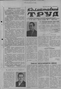 C. i & ^ U / U ^ U C U M S Пролетарии всех стран, соединяйтесь>?.._ f 0 6 р а щ е н и е к коммунистам и комсомольцам, колхозникам и колхозницам, рабочим и служащим совхозов, ко всем трудящимся Карасукского района ДОРОГИЕ ТОВАРИЩИ! Приближается 13 декабря—день открытия декабрьского Пленума ЦК КПСС, который обсудит вопросы дальнейшего развития сельского хозяйства нашей великой Родины. Отвечая на заботу партии и правительства о крутом подъеме народного хозяйства, трудящиеся нашего района внесли достойный вклад в выполнение SHAHID ний второго года семилетки—значительна х перевыполнили план продажи государ- п ству зерна, выполнили план по продаже t1 мяса и яиц. Но мы находимся в большом долгу перед государством по продаже молока. Чтобы выполнить план 1960 года, необходимо продать в декабре 8425 центнеров, что является трудной, но вполне посильной задачей. Для этого во всех хозяйствах района мы должны надоить в декабре не менее четырех литров в день от каждой фуражной коровы. Опыт передовых ферм показывает, что при правильной организации труда, ухода и содержания коров, этого добиться можно. Ферма № 1 совхоза им. Дзержинского (управляющий Г- В. Кацюба), бригада Ni? 5 колхоза „Маяк Ильича" (бригадир В. Н. Циберкин) в декабре добились ежедневных удоев от каждой фуражной коровы по 4 литра. Райком партии и райисполком обращаются ко всем коммунистам и комсомольцам, депутатам местных Советов, ко всем трудящимся района с призывом, чтобы в оставшиеся дни декабря личным участием помочь в продаже молока государству. Выполнение годового плана по продаже молока государству—дело чести каждого трудящегося района. Поэтому сейчас нет ответственней задачи, чем напряженная работа на фермах по организации правильного. кормления, поения, соблюдения распорядка дня, работа среди индивидуальных сдатчиков. Все на борьбу за выполнение государственного плана производства и продажи молока! Это будет нашим вкладом в выполнение второго года семилетки. РАЙКОМ КПСС РАЙИСПОЛКОМ 50 летие тов. Е. А. Фурцевой В связи"*: 5С-летием со дня рождения и отмечая большие заслуги перед Номм укистичесной партией и Советсним государством, Уназэм Президиума Верховного Совета СССР член Президиума ЦН КПСС, Министр культуры СССР товарищ Фурце- ва Е. А. награждена орденом Ленина. Центральный Номитет Номмуни- стичесной партии Советского' Союза и Совет Министров СССР горячо поздравили видного деятеля Иомму- нистичесной партии и Советского государства Е. А. Фурцеву в день ее пятидесятилетия и пожелали многих лет здоровья и дальнейшей плодотворной работы на благо нашей вели- ной социалистической Родины, на щ 1 благо коммунизма. 4CoUudcmu£H6M Орган Карасукского райкома Коммунистической партии Советского Союза и районного Совета депутатов трудяшихся_Новосиби£С]<ой^^об;1астт^и^им^ № 147 <2797) ! Пятница, 9 декабря“ ШО Т. I Цена 15 коп. Указ Президиума Верховного Совета РССФР О СОЗЫВЕ ВЕРХОВНОГО СОВЕТА РСФСР Президиум Верховного Совета РСФСР постановляет: созвать четвертую сессию Верховного Совета Российской Советской Федеративной Социалистической Республики пятого созыва 26 декабря I960 года в г. Москве. Ипетеедатель Президиума Верховного допета 1СФЬР 1м И. ОРГАНОВ. Секретарь Нрозядкуит Верховн >г.> 0 > ^СФСР ( . U r * l U е>. Москва. 3 декабря 1960 г. Ц н е м и н о ч ь ю НТО—это цех текущего ремонтаваогно.в Здесь'работают, четыребригад