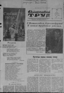 Ко л л е к т и в ны й т р у д 1 января 1961 года, М 1 I Зеленую улицу! ТОЛЬКО ВПЕРЕД ! Цифры, цифры, цифры. К новому году они вдоль и поперек выстраиваются в длинные ряды на бухгалтерских бланках. Сколько их! И за каждой - - живые люди, творцы больших дел будущего. Вот цифра 7,5 миллиона ш тук кирпича. Столько дал завод строительных материалов в минувшем году. Много ли это? И з него можно поставить около 400 четырехкомнатных торы нормы. И таких в каждомов. А вот еще одна цифра: 97. Это 97 удобных одноквартирных домиков сделали рабочие завода для населения. М о гли и больше, но подвел областной трест: 1400 кубо метров строевого леса недодал он. В наступившем году количество готовых домиков предполагается увеличить до 130. ... Канун праздника. Мы в столярном цехе. Словно с конвейера сходят дверные полотна,оконные переплеты. Годовое задание по ним уже давно перевыполнено, по полотнам, например, в четыре раза. А напряжение все нарастает. Да и как же иначе: спрос большой. Вон сколько строят в городе и районе! Надо успевать. И здесь редко кто не перекрывает задание. Вот Андрей Констанц. 170 процентов его дневная выработка. Петр Усольцев дает чуть меньше, но бывает и обгоняет товарища. Скоро столярный перейдет на поток. Что это даст? Предварительный подсчет обнадеживающий — в два раза увеличится производительность труда, улуч шится качество. В швейном цехе в прошлом году перевели на поток массовый пошив. Продукции стали давать гораздо больше, облегчился труд. Нынче переводится на поток и индивидуальный пошив — мастера требуют этого. дом цехе не перечесть:Е.Бух- миллер, Н. Разумовская, И. Милингер—из швейного, Н. Лысанюк, А. Набатов из пимокатного... А вот еще интересная цифра: 4,7 миллиона рублей. Это стоимость всей валовой продукции завода в 1959 году. В 1960 году эта цифра выросла до 6,3 миллиона рублей. А в третьем году семилетки она еще увеличился на 1,3 миллиона рублей. —А может быть и больше,— говорит директор т.Мелехов и начинает рассказывать о больших возможностях завода. В третьем кирпичном цехе в новом году будет работать люлечный конвейер, 16-камерная сводная кольцевая печь. Это намного улучшит качество кирпича. А недавно здесь установили пресс. 20 тысяч кирпичей за смену — такова его производительность. Ранее же стояла машина по мощности наполовину слабее. Будет усовершенствоваться производство и в других цехах. ...В 1961 году завод намечает достроить детский сад и сделать клуб. Средства есть — 450 тысяч рублей получено сверхплановых накоплений. В наступившем году предполагают иметь больше. Хорошие планы! Строителям мира С Новым годом, строители мира, Покорители рек и степей! Это вы на просторах Сибири Заковали в бетон Енисей. Это вы укротили пороги Грозной,бурной реки Янгары. И теперь на таежных дорогах Засиял свет грядущей зари. Вы держали ударные вахты, Шли к победе в строю трудовом. Ваши новые домны и шахты— Это жизни размах и подъем. Ваши спутники, ваши ракеты Мчатся в небе быстрее комет. И горят над страною Советов, Как созвездия мирных планет. Беспокойные сердца Нынче празднично в каждой квартире , Сытный стол и бокалы полны. С Новым годом, строители мира! Мир вам, люди Советской страны! Н. ДУБКОВ. Больше других загружен камышитовый цех. Но его заведующий т.Шапоренко не растерялся. Предстояло о т грузить 50 тыс. квадратных метров камышитовых плит,а отгружено 67 тысяч. В цех