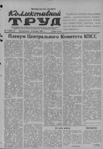 г г \ Пролетария ;ш стран, соединяетесь) ICbUudcmufoieai Т Р У Д Орган'Карасунекого райкома Коммунистической партии Советского Союза _______ и районного Совета депутатов трудящихся Новосибирской области № 7 (28011) | Воскресенье, 15 января 1961 г. | Цена 2 коп. Трудящиеся района! Шире развертывайте социалистическое соревнование в честь предстоящего очередного съезда КПСС, боритесь за досрочное выполнение планов третьего года семилетки! \ V * Пленум Центрального Комитета КПСС В Москве продолжает работу Пленум Центрального Комитета КПСС. Обсуждается второй вопрос повестки дня о выполнении Государственного плана исоциалистических обязательств по производству и продаже государству продуктов земледелия и животноводства в 1960 году и q мероприятиях по дальнейшему развитию сельского хозяйства. Выступивший па вечернем заседании 11 января первый секретарь Центрального Комитета компартии Казахстана Д. А. Кунаев в своем докладе отметил, что Казахская ССР занимает теперь значительный удельный вес в производстве товарного зерна и продуктов животноводства. Но достигнутый уровень производства продуктов сельского хозяйства еще далеко не достаточен и не соответствует большим возможностям, которымирасполагает Казахстан. Тов. Кунаев остановился на задачах улучшения использования машинно-тракторного парка, создания постоянных механизаторских кадров, а также на расширении посевов хлопчатника, риса, сахарной свеклы и дальнейшего развития животноводства. Говоря о работе с кадрами, докладчик заявил, что в этом деле имеется еще много серьезных недостатков. Первый секретарь краевого комитета партии Целинного края Казахской ССРТ. И. Соколов говорил о великой программе освоения новых земель на востоке страны. В ближайшие 2—3 года производство зерна в крае должно быть доведено до1100—1200 миллионов пудов. Тем самым будет превышен на 200—300' миллионов пудов уровень производства зерна,намеченный на конец семилетки. Значительное развитие на целине должно получить животноводство, в частности, тонкорунное овцеводство. Большое место в докладе отведено вопросам рентабельности совхозов п капитальному строительству. Важнейшие вопросы' развития земледелия и животноводства в Белоруссии осветил в своем докладе первый секретарь ЦК КП Белоруссии К. Т. Мазуров. Он сообщил о мероприятиях, разработанных в республике для увеличения производства всех видов сельскохозяйственной продукции. Докладчик подробно остановился на вопросах мелиорации. Он сказал, что при соответствующей помощи Белоруссия может прибавить к имеющимся шести миллионам гектаров пашни около четырех миллионов гектаров замечательной целины — осушенных трофяников. Тов. Мазуров отметил, что в Белоруссии еще не искоренено поверхностное, декларативное руководство колхозами и совхозами, аллилуйство и пустозвонство. Заседание Пленума 12 января началось выступлением первого секретаря ЦК КПУзбекистана Ш. Р. Рашидова. 0п доложил Пленуму о том, что годовой план продажи государству продуктов животноводства республикой выполнен с превышением.Но хлопкоробы остались в большом долгу перед государством, выполнив план заготовок хлопка лишь на 94 процента. Тов. Рашидов привел яркие цифры, свидетельствующие о подлинной революции,'которую принесла техника на хлопковые поля. Значительную часть доклада тов. Рашидов п