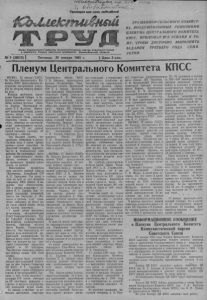 1 4 t 'tC Орган Карасукскогсг райкома Коммунистической партии Советского Союза и районного Совета депутатов трудящихся Новосибирской области № 9 (28013) | Пятница, 20 января 1961 г. | Цена 2 коп. « g g a c иw Iw i тяпшя*яшшшва11гчрштшвваттяявяяшкег2ашшяшивгявввшшшшкяка*я9"*шявяшвщаввяшя£ЗЯ^ашшшякякяшшяшк*ш ТРУЖЕНИКИ СЕЛЬСКОГО ХОЗЯЙСТВА, ВООДУШЕВЛЕННЫЕ РЕШЕНИЯМИ ПЛЕНУМА ЦЕНТРАЛЬНОГО КОМИТЕТА КПСС, ПРИЛОЖАТ ВСЕ УСИЛИЯ К ТОМУ, ЧТОБЫ ДОСРОЧНО ВЫПОЛНИТЬ ЗАДАНИЯ ТРЕТЬЕГО ГОДА СЕМИЛЕТКИ. Пленум Центрального Комитета КПСС •: МОСКВА, 16 января (ТАСС). На Пленуме Центрального Комитета КПСС продолжается обсуждение заслушанных докладов по второму вопросу повестки дня. Важным проблемам земледелия Западной Сибири и Зауралья посвятил свое выступление полевод колхоза «Заветы Ленина» Курганской области Т. С. Мальцев. Известный колхозный ученый, делясь опытом, сказал, что в хозяйстве проводят своим способом обработку земли. Благодаря этому, несмотря на систематически повторяющиеся засухи, средний за 12 лет урожай яровой пшеницы составил 20 центнеров с гектара. Тов. Мальцев заявил, что уральцам, сибирякам и казах- станцам надо в одном крепко помочь—-лучше оснастить их уборочной техникой, приспособив ее к особенностям этих районов. Он подчеркнул высокую ответственность специалистов, особенно агрономов, за правильное ведение земледелия, за урожай. Взволнованно прозвучала речь знатного свинаря совхоза «Катениеки» Латвийской ССР А. Н. Бартулиса. Год назад в этом же зале он дал обещание откормить 3000 свиней и выполнил свое обязательство. Его в письме поздравил с успехом Н. С. Хрущев. При горячей поддержке товарищей, сказал тов. Бартулис, я обязался в третьем году семилетки откормить не менее пяти тысяч свиней общим весом 4,5 тысячи центнеров. С яркой речью выступила встреченная аплодисментами Герой Социалистического Тру- да Турсуной Ахунова—механик-водитель хлопкоуборочной машины, бригадир * колхоза имени Кирова, Ташкентской области. Она подчеркнула огромную роль комплексной механизации хлопководства. Ее бригада взяла новое обязательство—на каждом из ста гектаров хлопчатника вырастить урожай по 50 центнеров. Тов.Ахунова обязалась собрать при помощи машин 350 тонн хлопка. На Пленуме было оглашено письмо краснодарской делегации на имя Первого Секретаря ЦК КПСС Н. С. Хрущева, В этом письме горячо одобряются советы и предложенияН.С.Хрущева о том, чтобы получить с площади 350 тысяч гектаров по 60 центнеров кукурузы с гектара и продать государству 150 миллионов пудов хлеба. 16 января в прениях по докладам выступили секретарь Горьковского обкома КПСС Л. Н. Ефремов, председатель колхоза «Пограничник» Тянь- Шаньской области Киргизской ССР Т. А. Акунов, председатель исполкома Свердловского областного Совета депутатов трудящихся К. К. Николаев, председатель колхоза имени Тукая Татарской АССР Г.Н.Гарифуллин, секретарь Запорожского обкома КП Украины В. В. Скрябин, секретарь Каневского райкома КПСС Краснодарского края А. С. Колесников, старший чабан совхоза «Червленные Буруны» Дагестанской АССР Д. А. Махсутов, председатель колхоза «Украина» Хмельницкой области Г. И. Ткачук, секретарь Костромского обкома КПСС Л. Я. Флорентьев, председатель колхоза имени Мичурина Саратовской области А. А.Чус- ляев и другие. МОСКВА, 17 января (ТАСС). На Пленуме Центрального Комитета КПСС продолжа