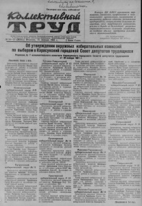 31 января 1961 года,М 1 4 -15 КОЛЛЕКТИВНЫМ ТРУД „ ..................... .. - тг- | Об утверждении окружных избирательных комиссий по выборам в Карасукский городской Совет депутатов трудящихся Решение N° 7 исполнительного комитета Карасукского городсного Совета депутатов трудящихся от 26 января 1961 г. (Продолжение, Нан, на1-й стр,). Секретарь окружной избирательной комиссии Бондаренко Екатерина Ильинична— от рабочих, служащих и ИТР мясокомбината. I Члены окружной избирательной комиссии: Мельниченко Алексей Федорович—от работников РИС, Гришко Нина Никифоровна—о т ' работников Почтовый избирательный округ № 41 Председатель окружной избирательной комиссии Земляной Поликарн Тихонович—от работников РПС. Заместитель председателя окружной избирательной комиссии Снегирев Николай Васильевич—от работников РПС. Секретарь окружной избирательной комиссии Тютькова Надежда Ивановна—от коллектива завода стройматериалов. Члены окружной избирательной комиссии: Лемзякова Александра Антоновна— от рабочих и служащих завода стройматериалов, Чеботарев Дмитрий Иванович—от рабочих и служащих завода стройматериалов. Во кзальный избирательный округ J\s 42 Председатель окружной избирательной комиссии Шаманский Петр Сергеевич— от работников РИС. Заместитель председателя окружной избирательной комиссии Гапоненко Иван Григорьевич— от работников РПС. Секретарь окружной избирательной комиссии Посвит Матрена Иосифовна — от работников РПС. Члены окружной избирательной комиссии: Авжанов Шарнн — от рабочих и служащих райпищекомбината, Сизикова Наталья Алексеевна — от рабочих и служащих райиищекомби- ната. , Вокзальный избирательный округ № 43 Председатель окружной 'избирательной комиссии Пешков Николай Си- лантьевпч— от работников Карасукского горпо. Заместитель председателя окружной избирательной комиссии Горобец Алексей Лукич—от работников Карасукского горпо. Секретарь окружной избирательной комиссии Лысенко Зинаида Петровна — от работников Карасукского горпо. Члены окружной избирательной комиссии: Мальцева Мария Ивановна— от работников Карасукского горпо,Лебедева Валентина Николаевна — от работников Карасукского горпо. Транспортный ибирательный округ N° 44 Председатель окружной избирательной комиссии Скороход Николай Павлович--от рабочих н служащих мол- комбината. Заместитель председателя окружной избирательной комиссии Осипенко Василий Иванович— от рабочих и служащих молкомбината. Секретарь окружной избирательной комиссии Тараканова Галина Викентьевна— от рабочих и служащих СМП-16. Члены окружной избирательной комиссии: Гим'анова Лидия Ивановна— от рабочих н служащих СМП-16, Корниенко Юлия Михайловна—от рабочих и служащих СМП-16. Заводской избирательный округ № 45 Председатель окружной избиратель1 ной комиссии Кропотов Петр Васильевич—от рабочих и служащих мол- комбината. Заместитель председателя окружной избирательной комиссии Букеев Ва- ■силий Иванович—от рабочих и служащих молкомбината. Секретарь окружной избирательной комиссии Серомахина Валентина Никаноровна—от рабочих и служащих молкомбината. Члены окружной избирательной комиссии: Попик Анастасия Акимовна— от рабочих и служащих молкомбината, Шатских Виктор Константинович— от рабочих и служащих молкомбината. Калининский избирательный округ № 46 Председате