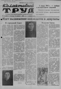 Qfa лллоТ еяол_^ Пролетарии всея стран, соединяйтесьI 1 Орган^Карасукского* райкома ^-Коммунистической партии Советского Союза f ' и районного Совета депутатов трудящихся Новосибирской области 5 марта 1961 г. — выборы в местные Советы депутатов Пошлем в органы государственной власти лучших представителей трудящихся № 19 (2824) | Пятница, г. | Цена 2 коп. ов- •Идет выдвижение кандидатов в депутаты В городской Совет Дружно проходят предвыборные собрания в уч реждениях, предприятиях, на стройках города по выдвижению кандидатов в Ка- расукскчй городской Совет депутатов трудящихся. Ра бочие, служащие и интеллигенция называют имена самых лучших, передовых людей своих коллективов, доверяя им высокие, почетные. обязанности будущих депутатов. ф # На состоявшемся общем собрании работников черепичного, столярного и пи- мокатного цехов завода стройматериалов тт. Н .Исаев, Ф. Шевченко, П. Лашин и другие предложили избрать кандидатами в депутаты горсовета передовых ц. производственниц, активных ^ общественниц, хороших товарищей зарощика валяной обуви Татьяну Дмитриевну Рыбалко и бригадира формовочной бригады по гончарной черепице Дарью Петровну Баган. За их предложения единогласно проголосовали все присутствующие и п р о с и л и тт. Рыбалко и Баган дать свое согласие баллотироваться по Луначарскому № 15 и Кировскому № 33 избирательным округам. Здесь же после избрания доверенных лиц коллектив пересмотрел свои возможности и взял повышенное обязательство в честь выборов в местные Советы, решив выполнить производственный план февраля за три недели. •X- Я- * Около 300 работников Ка- расукского автохозяйства единодушно назвали своим кандидатом в депутаты горсовета по Свердловскому избирательному округу №21 своего лучшего шофера Николая Михайловича Баулина. * * * Заведующую красным уголком, руководителя жен- совета, члена КПСС Зинаиду Михайловну Смольникову выдвинул своим кандидатом по Максимо-Горьковскому избирательному окру гу № 20 многочисленный коллектив стрелочников, путейцев, кондукторов, составителей поездов и паровозных бригад отделения временной эксплуатации. * * * По Инкубаторному избирательному округу № 49 и Чкаловскому № 47 работники мясокомбината просили дать свое согласие баллотироваться старейшую рабочую жирового цеха комбината беспартийную Анну Даниловну Лисину и лучшего мастера пищевого цеха комсомолку Антонину Кузьминичну Сидоренко. * * * От коллектива пищеком- бината зарегистрирована кандидатом в горсовет по Демьяно-Бедновскому избирательному округу № 5 зарекомендовавшая себя хорошей производственницей, активной общественницей и чутким товарищем Елизавета Андреевна Храповицкая. Все это—достойные люди, кандидаты блока коммунистов и беспартийных. Нет сомнения,что избиратели еди нодушно отдадут за них свои голоса в день выборов в местные Советы депутатов трудящихся 5 марта. ТЙГ т!г Рабочие пимокатного. кирпичного и черепичного цехов завода стройматериалов выдвинули своим кандидатом в городской Совет депутатов трудящихся одну из лучших производственниц, активную общественницу, члена жен- совета Татьяну Дмитриевну Рыбалко. НЯ СНИМКЕ: Т Д Рыбалко, тйг ☆ ☆ Коллективу Еарасукского СМУ треста «Запсибхлебо- строя»выпала большая честь— выдвинуть из своего коллектива кандидата в депутаты районного Совета. По этому случаю" 4 ф