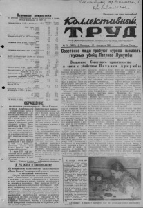 КОЛЛЕКТИВНЫЙ т р уд 17 февраля 1961 года, М 22 Лекции, концерты, вечера Красный уголок лесхоза. Здесь находится агитпункт Центрального избирательного участка. В помещении много света, тепло, уютно. На столах—подшивки газет, различные брошюры, книги. Бросаются в глаза красочно оформленные плакаты «5 марта— День выборов в местные Советы» и «Наши кандидаты в депутаты». Сюда то и дело приходят избиратели, агитаторы. Одни из них—почитать газеты, послушать беседу или поиграть в шахматы, другие-свериться в списках избирателей, посоветоваться с заведующим агитпунктом т. Челышковым, чем заниматься на десяти- дворке. Избиратели участка уже прослушали лекцию о советской избирательной системе, получили юридическую консультацию по советскому трудовому законодательству, ознакомились с решениями январского Пленума ЦК КПСС. агитпункт организовал для из- биратёлей’ концерт художественной самодеятельности учащихся Карасукской восьмилетней школы № 2. Перед концертом собравшиеся прослушали лекцию преподавателя этой школы А. Г. Вылегжаниной] о воспитании подростков. Избирателям очень понравилось выступление школьного хора, руководит которым Д. Касьянов.Тепло было встречено выступление трио — Л. Павской, Н. Кащеевой и Р. Передериенко, русский перепляс и другие номера. Зрители горячо поблагодарили учащихся и просили их чаще давать такие концерты. В ближайшее время в агитпункте будет проведен вечер вопросов и ответов, прочитан доклад о советских Вооруженных силах. * * # В красном уголке элеватора Долой Хаммаршельда! Центральная усадьба совхоза им. Дзержинского. Гараж, Более ста человек собралось вчера здесь,чтобы послушать последние сообщения из Конго. Секретарь парткома совхоза т. Жуков рассказал об убийстве бельгийскими колоши аторами национального героя Африки II. Лумумбы и о Заявлении нашего правительства по этому поводу. Один за другим выступают шофер Н. Коваленко, председатель рабочкома И. Моргун, рабочий Д.Гребнёв и др. г -Бельгийцы, прочь из Конго! Долой Хаммаршельда! Убийц— к ответу! — в один голос заявили они. П. Деревнин. УБИЙЦ-К ОТВЕТУ Собрание пайщиков Карасукского горпо высказало свое гневное возмущение по поводу злодейского убийства вождя конголезского народа Патриса Лумумбы и его соратников. Участники собрания целиком поддержали Заявление Советского правительства, сделанное по этому поводу. М. Симоненко. Возмущаемся до глубины души Мы услышали о бандитском налета французских воздушных пиратов на наш советский самолет, на борту которого находилась делегация во главе с Леонидом Иль- ичем Брежневым. До глубины души возмущает нас позорный акт ко лонизаторов. Семь лет алжирские патриоты ведут освободительную борьбу Против французских поработителей. Семь лет президент Франции Шарль де Голль стремится надеть своими кровавыми руками хомут колониализма на шею алжирского народа Я теперь французская военщина протягивает руки к советскому самолету. Мы хотим, чтобы наш гнев дошел до президента Франции: не играй с огнем! Ученики восьмого класса железнодорожной школы № 75. Раньше срока ! Сейчас агитаторы знакомят избирателей десятидворок с биографиями кандидатов в депутаты, разъясняют избирательный закоп. На днях из ремонтной мастерской совхоза им.Дзержинского вышел последний, 106-й трактор. Коллектив работников РТМ и механизатор