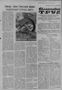 (U u f^ Завтра— День Советской Армии НАДЕЖНЫЙ СТРАЖ МИРА Пролетарии всех стран, соединяйтесь} fQKUdcmufouiA Ширится, весенним половодьем разливается по стране всенародное социалистическое соревнование в честь XXII съезда КПСС. Все более обильные плоды приносит вдохновенный мирный труд народа. И на страже этого труда, на защите счастья и спокойствия нашего любимого Отечества бдительно и надежно стоят Советские Вооруженные Силы. Они оберегают мир на земле, безоблачность нашего неба, улыбки детей, каждый шаг Родины, приближающий нас к светлой цели — коммунизму. Советские люди знают, что воины Армии и Флота всегда в боевой готовности, в любую минуту готовы с честью выполнить свой ратный долг. Доверие и любовь народа к сынам-воинам безграничны. ...Недавно в одном из районов столицы во время строительных работ глубоко в земле была обнаружена невзо- рвавшаяся тысячекилограммо• вая фашистская авиационная бомба. Почти двацатг лет пролежала она здесь, тая в ' себе страшные силы разрушения. Для ее извлечения срочно прибыли воины Советской Армии, специалисты-саперы. Катастрофа была предотвращена. Правительство наградило воинов-смельчаков орденами и медалями. Уничтоженная ими бомба—не единственная. Только в 1960 году специали- сты-подшвники этого подразделения под руководством майора Н. Балабанова обезвредили И тысяч бомб, снарядов и мин. Как видим, и в мирные дни сложна и напряжеына, ответственна и почетна воинская служба, которую несут в рядах Армии и Флота сыны народа. Паша доблестная армия, созданная Коммунистической партией и великим Лениным для защиты завоеваний Октября, верно стоит на своем почетном, боевом посту. Мноог раз вражья нечисть пыталась сокрушить ее силу, чтобы отнять свободу у нашего народа, разграбить богатства нашей Родины. Но Советская Армия отразила все атаки врага и вышла победительницей. «Вечно будет жить,—говорил Н. С. Хрущев на IV сессии Верховного Совета СССР,—слава о доблестных сынах и дочерях нашего народа,которые пролили кровь, отдали свою жизнь в борьбе за свободу и независимость Родины в гражданскую войну и Великую Отечественную войну». Проявляя в боях беззаветную преданность своему социалистическому Отечеству, высокое воинское мастерство, беспримерный массовый героизм, советские воины переплыли сотни рек, прошли пол- Европы, раздавили фашистского зверя в его логове и над поверженным Берлином водрузили знамя Победы. Благодарные народы мира назвали советского солдата воипом- освободителем. Свыше семи миллионов солдат, матросов, сержантов,старшин, офицеров, генералов и адмиралов— участников Великой Отечественной войны—были награждены орденами и медалями Союза ССР, более И тысяч человек удостоены высокого звания Героя Советского Союза. Сейчас Советские Вооруженные Силы, в соответствии с решениями IV сессии Верховного Совета СССР, численно сокращаются на одну треть. 1.200 тысяч людей армейской закалки и выучки возвращаются к мирному труду. Они снова встают к станкам, садятся за' рули тракторов и комбайнов, идут на животноводческие фермы. Это сокращение армии лишний раз свидетель- ствует о миролюбивой политике нашего государства, о добрых устремлениях советского народа. В то же время это не наносит ущерба нашей обороноспособности. Сейчас наступило время, как отмечается в Заявлении представителей коммунис