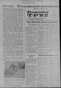 &$a ^uJiM uaS'^ec_, Сегодня - Международный женский день Первый праздник весны Кажется, совсем недавно срывали мы листок календаря за 8 марта 1960 года, как будто вчера. А сегодня снова эта же светлая дата. Увлеченные большими делами, мы не заметили, как год прошел. Но, оглянувшись, сегодня не без удивления замечаем, как много дел свершилось за короткий отрезок времени. Наша страна под руководством Коммунистической партии еще шаг сделала по пути выполнения семилетнего плана. Во всех делах, больших и малых, участвует советская женщина, равноправная с мужчиной. Особенно велики успехи животноводов нашего района, дружно откликнувшихся на исторические решения январского Пленума ЦК КПСС. Доярки А. Н. Морозова, Э. А. Бальцер, Е. И. Дри- дигер, Т. Н. Бондарева прославились на весь район хорошими делами. В прошлом году они надоили до 27 ц молока от каждой коровы, а нынче обязались довести надои до 30 центнеров. Это небывалый показатель в нашем районе. Женщины-доярки 4 и 5-й бригад колхоза „Мгяк Ильича", второго отделения Студеновского совхоза по праву заняли ведущее место в районе. Птичницы совхоза им. Дзержинского тт. Бунина и Пасынкова ухаживают за 2000 кур. А после Пленума ЦК КПСС обязались довести поголовье до пяти тысяч и получить от каждой несушки 120 яиц в год. Достижения наших животноводов и есть те самые маяки, говорил в своей речи на январском Пленуме Н. С. Хрущев, которые указывают правильный путь к высокой производительности труда, повышению уровня производства в бригаде, на ферме, в колхозе и совхозе. Таких маяков у нас много, и на них держат равнение все труженики района. А разве не маяк коллектив станции Карасук-И, руководимый Евдокией Кондратьевной Ениной? В октябре минувшего года ему присвоено почетное звание бригады коммунистического труда. Этого же почетного звания удостоен коллектив жестяно-баночного цеха молочноконсервного комбината, в котором трудятся славные, женщины: Н. Е. Саблина, М. М. Петренко, М. А. Кононенко, Е. П. Шолохова, В. Е. Лукаш и др. За коммунистический труд борются женщины Карасукского элеватора. Впереди идет бригада на погрузо-разгрузочных работах, которой руководит Г. И. Гузеева. Три дня назад мы были свидетелями яркой демонстрации подлинной советской демократии, политического равноправия женщин. В местные Советы по нашему району их избрано 155. Народ послал в Советы врачей А. В. Макашову и Л. А. Васильченко, учительниц Р. К. Новикову и Р. Д. Казадаеву, доярок А. Н. Морозову и А. А. Шаравину, старшую стрелочницу В. А. Скрипни- кову и др. Сегодня, в радостный праздник весны, женский день 8 марта, поздравляем наших славных подруг, желаем им и дальше без устали идти к вершинам счастья. Пртлетлщш всех стран, соединяйтесьt 4 На третьей ферме- совхоза ■Одтапрь» заведена хорошая традиция. Здесь над квартирой передовой доярки прикрепляют переходящий красный вымпел. Жители села, да а проезжие, сразу могут узнать, кто сегодня впереди. На этот раз флажок пламенел сад квартирой Зины Сычевой. Мы попросили ее рассказать о себе. — Дояркой я пошла сразу после окончания школы и работаю вот уже пять лет. Люблю свою профессию н коров. Кажется, пользуюсь взаимностью к у них. НА СНИМКЕ: Зииа Сычева со своей любвмпцей. Текст и фото Ю. Шипицина, 4C bU u ekn u t£H au Орган Карасукского райкома Коммунистической партии Советского Союза и районного Совета депутатов трудящихс