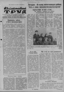 22 марта 1961 года, М 36 КОЛЛЕКТИВНЫЙ ТРУД 3 Передовикам соревнования — почетные грамоты П п с м ш в Вопрос об итогах соревнования животноводов обсуждался живо, без споров, потому что речь шла о добрых делах. Дояркам, скотникам, чабанам директор т. Осинцев вручал почетные грамоты, говорил напутственные слова, благодарил за успехи. И есть за что. Высокими надоями молока, привесами, богатыми приплодами отличаются животные отделения, где управляющим В. Н. Перелетов. Вот телятник. Хозяйка здесь Наталья Касьян. У нее 36 телят. Если бы она надеялась только на одно молоко, разве бы нолучила по 850 граммов привеса в сутки. Словно заботливая мать за детьми, телятница присматривает за своими.питомцами. То приготовит сенной отвар, то овсяным киселем накормит, и телята растут, как на опаре. А вот гурт взрослых телят скотника Павла Ляпина. Его бычки и телочки прибавляют в весе по 700 граммов в сутки. Еще лучших результатов в соревновании добился чабан т. Марченко. В начале этого года он брал обязательство получить на каждые 100 овцематок по 115 ягнят и настричь по 3,5 кг шерсти от овцы. Дал слово и горячо взялся за дело. Когда окот закончился, подвели итог. Оказалось, что на каждые сто маток обошлось не по 115, а по 132 ягненка. Чабан пересмотрел свое обязательство и решил получить не по 3,5 кг шерсти от овцы, а по 4,5 кг. Хороших результатов в соревновании добились и доярки. Они получают более семи литров молока на корову в сутки. Екатерина Охременко надаивает^ почти по 9 литров. Ей не уступают Зоя и Юля Шаравины. Сегодня, оставив на время дела и заботы, многие работники фермы прибыли на третий съезд животноводов, чтобы поделиться успехами, наметить новые планы, перенять хороший опыт. В. Перелетов. Это же безобразие! В селе Ольговке живет 12 семей казахов. В каждом дворе 2— 3 собаки. И ни одна не привязывается. Эти гончие н борзые псы величиной с теленка свободно разгуливают по селу, рвут и душат колхозных кур и уток на птицеферме, бросаются на людей. Однажды искусали гражданку Тавтакову и ее шестилетию® дочку. Колхозники и их дети боятся свободно пройти по улице. Об этом мы говорили не раз работникам Благодатского сельского Совета, предъявляли жалобы и председателю т. Васильеву, но все остается по-прежнему. В. Сниткин, келхоеник. В чайной должно быть чисто Будучи дежурным дружинником по городу, я зашел в чайную. И вот что увидел.Развалившись сидят за столиком 6 пьяных парней, курят, окурки бросают на пол. Оглядываюсь кругом—нет ни пепельниц,ни урн.Выходит,не разрешается ни курить, ни распивать спиртные напитки в чайной. Так почему тогда официантки молчат, не подскажут вот этим «разудалым», что чайная— общественное место, а не ресторан. Директору чайной Бреусу надо заботиться не только о вкусной пище, а об уюте, чистоте в помещении. В. Четвериков, рабочий СМУ. fl батарей питания нет У нас на двенадцатой ферме совхоза им. Дзержинского приобретен радиоприемник,Родина 52“ . Но прошел уже месяц, а мы все не можем достать батарей питания. Люди с удовольствием слушали бы после работы Последние известия, другие радиопередачи, но этого, к сожалению, не случается. Почему райпотребсоюз не заботится о том, чтобы в район регулярно завозили батареи питания? К. Жангуттин. Аул Ка, а :у-Казах. Разве Последовательницы Турсуной Ахуновой АНДИЖАНСКАЯ ОБЛАСТЬ. Этибархон Набиева и Ташхон Махмудова, следуя п
