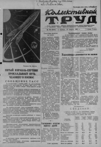 o r . и Г Ж ^ ы < А , 7 . . Рисунок Вл. Шуста. ПЯТЫЙ КОРАБЛЬ-СПУТНИК ПРОКЛАДЫВАЕТ ПУТЬ ЧЕЛОВЕКУ В КОСМОС С О О Б Щ Е Н И Е Т А С С В соответствии с планом работ по исследованию космического пространства, 25 марта 1961 года в Советском Союзе на орбиту вокруг Земли выведен пятый корабль-спутник. Основной целью запуска является дальнейшая отработка конструкций корабля-спутника и установленных на нем систем, предназначенных для обеспечения жизнедеятельности человека при полете его в космическом пространстве и возвращении на Землю. Корабль-спутник двигался по орбите, близкой к расчетной— период обращения 88,42 минуты, высота перигея— 178,1 километра, высота апогея 247 километров от поверхности Земли и наклонение орбиты к плоскости экватора 64 градуса 54 минуты. Вес корабля-спутника 4.695 килограммов без учета веса последней ступени ракеты-носителя. На корабле-спутнике была установлена кабина с подопытным животным^—собакой Звездочка и другими биологическими объектами, а также телеметрическая и телевизионная системы, радиосистема для траекторных измерений и аппаратура радиосвязи. Бортовая аппаратура корабля работала в полете нормально. После выполнения намеченной программы исследований корабль-спутник в тот же день по команде совершил успешный спуск с орбиты вокруг Земли и приземлился в заданном районе. Предварительное обследование приземлившегося корабля-спутника показало, что подопытное животное чувствует себя нормально. В результате проведенного запуска пятого советского корабля-спутника и успешного спуска его с орбиты получено большое количество ценных данных как о работе конструкции корабля и его систем, так и по характеру воздействия условий полета на живые организмы. В настоящее время производятся изучение и обработка этих данных. Над биологическими объектами, совершившими полет, установлено наблюдение. bifiA Пролвтацаа vcex стран, соедамяЛтесь1 iCbUM tcm uBHSM . Орган Карасукского райкома Коммунистической партии С°ввтского Союэа и районного Совета депутатов трудящихся Новосибирсной области N° 39 (2841) | Среда, 29 марта 1961 г. S Цена 2 коп. ТрактЬры вышли на поля Степь понемногу оживает. Нарушая безмолвие полей, выходят на взгорки тракторы. Это механизаторы тт. Новоселов и Ялексеев на „ДТ-54" выехали на задержа ние талых вод. На первом отделении совхоза „Октябрь1* эта работа проведена на 150 га. На площади более 200 га задержаны талые воды на третьей ферме трактористом В. Тышенко. Там, где задержана влага, рабочие решили посеять кукурузу. На это поле вывезено более ста тонн навоза и в двух направлениях проведено снегозадержание. Начало свои первые весенне-полевые работы и механизированное звено четвертой фермы, выступившее с обязательством вырастить стопудовый урожай зерновых. Т. Ермоленко, агроном. Будем выращивать свеклу Бывает еще, что принимая в начале года высокие обязательства, мы много шумим о них, а в конце года замолкаем, видя, что они не выполняются. Об этом упоминал в своей речи на зональном совещании передовиков сельского хозяйства Западной и Восточной Сибири Н. С. Хрущев . Мы обсудили речь Никиты Сергеевича у себя в коллективе и взяли обязательство надоить нынче по 25 ц молока от коровы. А чтобы заложить основу под свои обязательства, в дополнение ко всем кормам каждая доярка фермы засеет и обработает по 0,15 га свеклы. Недалеко от фермы нам 