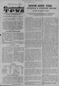 JCOix. V Осел) UsP. я, ^ Q^U Лс, fu>ujd Г , Пролет арии всех стран, соединяйтсьI $CbUueJcmu&HsuL Орган Карасукского райкома Коммунистической партии Советского Союза н районного Совета депутатов трудящихся Новосибирской области №43 (2845) | ПЯТНИЦА, 7 АПРЕЛЯ 1931 г, | ЦЕНА 2 КОЛ, Пэ примеру чгриркурьимскчх школьникзз После десятилетки— в колхоз Цесятый класс Благодатской средней школы небольшой—всего пять человек. Но это тесно спаянный, дружный коллектив. Недавно ребята обсудили призыв Чернокурьин- ских школьников и тоже решили по их примеру после десятилетки всем классом, остаться работать в колхозе им. Тель мана. Цесятиклассники изучили комбайн, лафет, поэтому Л. Греб, А. Квитко, А. Грузин и Ю. Хохлов будут трудиться механизаторами, Г. Колечков решил пойти плотником. Совещание механизаторов Недавно состоялось совещание механизаторов Хо- рошинского совхоза. На него съехались трактористы, бригадиры, звеньевые,учетчики. управляющие фермами. Главный агроном совхоза т. Черненький рассказал собравшимся о тех задачах , которые предстоит решить в весенне-летний период. Механизаторы обменялись мнениями, как получить высокий урожай зерновых и других культ}р. Бригадир т. Авраменко, например,рассказал о почине тракториста т. Шеля, который обязался получить 105 пудов пшеницы и 115 пудов овса с гектара. За ним закреплен участок земли в 500 гектаров. Механизаторы хоть сего- д 1я го овы к выезду в поле. Л. Рогозный. К севу давно готовы Степь преобразилась. Почернели поля, освободившись от снега. Над ними едва заметное марево. Скоро на широких массивах четвертого отделения Хорошин- ского совхоза начнется весенняя страда. Для сева все готово: на ходу все восемь тракторов, плуги, сеялки, лущильники, сцепки и бороны. Ждет хозяев полей отремонтированный вагончик. За механизаторами закреплена техника. В ожидании, когда нрихет пора сеять, рабочие не сидят сложа руки. Они задерживали талые воды, а. сейчас вывозят и разбрасывают по полям навоз. Нынешняя весна будет особенно жаркой для хлеборобов. Чтобы осуществить свои большие планы, придется упорно потрудиться. Александр Шель взял обязательство на участке в 400 га получить по 105 пудов пшеницы с каждого гектара и на ста гектарах по 115 пудов овса. Дело это ему привычное, а главное, по душе. На технику полная надежда—сам ремонтировал. Все механизаторы нашего отделения готовы встретить сев во-всеоружии. М. Киба, учетчик. СВЕДЕНИЯ о надоях молока за 1-ю пятидневку апреля 1961 г. Колхозы Надоено Колхозы Надоено и совхозы молока на корову и совхозы молока на корову Им. Тельмана 25,7 Им. Дзержинского 31,0 «Маяк Ильича» 30,9 «Октябрь-' 23,0 «Вперед к коммун.» Им. Куйбышева 26,1 26,0 Студеновский 34,2 «Новая семья» 33,7 Хорошинский 29,7 Им Жтанова 23,0 Итого по совхозам 29,0 Итого но колхозам 28.4 Всего по району 28,8 И З В Е Щ Е Н И Е Исполнительный комитет Карасукского городского Совета депутатов трудящихся доводит до сведения всех депутатов городского Совета, квартальных, руководителей учреждений и предприятий города, что 11 апреля 1961 г. в помещении железнодорожного клуба в 11 часов дня созывается вторая сессия городскогоСовета депутатов трудящихся (восьмого созыва), где будет рассмотрен вопрос „О благоустройстве города' . Исполком горсовете. ВЫРАСТИМ ВЫСОКИЕ УРОЖАИ кукурузы и сахарнйо свеклы! О Б Р А Щ Е Н И Е ко всем работникам кукурузоводческих и свекловодческих звеньев, 