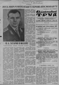 4 КОЛЛЕК ТИВНЫЙ ТРУД 16 апреля 1961 гоёа,№ 47 Беспримерное достижение советских людей Советский человек в космосе!—эта радостная весть мгновенно облетела весь мир. Повсюду люди выражают восхищение грандиозной победой советского народа. В адрес, советского посольства в Румынии поступают многочисленные поздравления от трудящихся и руководящих деятелей республики, коллективов промышленных предприятий, глав дипломатических представительств. Первый секретарь ЦК Румынской рабочей партии, Председатель Государственного Совета РНР Георге Георгиу-Деж поздравил с победой советских конструкторов, пожелал здоровья Ю. А. Гагарину и передал свои наилучшие пожелания Н. С. Хрущеву. Г. Георгиу-Деж подчеркнул, что это большая победа всего социалистического лагеря. Не было еще такой новости, которая распространилась бы в Будапеште так быстро, как сообщение о первом космическом полете советского человека. Всего лишь через несколько минут после сообщения ТАСС будапештское радио передало в экстренном выпуске эту потрясающую новость. Имя советского гражданина Юрия Алексеевича Гагарина на устах у всех. Люди разных возрастов, профессий, знакомые и незнакомые поздравляют друг друга, пересказывают услышанную новость. Мы гордимся вами, советские люди, говорят трудящиеся венгерской столицы. О первом советском космонавте Юрии Алексеевиче Гагарине говорят на промышленных предприятиях, в учреждениях, на новостройках Польши. Сказка стала былью!Это совершил советский народ, страна, успешно строящая коммунизм! —с восхищением заявляют польские трудящиеся. —Передайте наши самые горячие поздравления советским людям. Мы горды успехами своих советских братьев. Невероятно, фантастично,— так говорят все пекинцы. Весть об успешном запуске Советским Союзом человека в космос произвела настоящую сенсацию в Соединенных Штатах. Последние выпуски нью Йоркских газет вышли под огромными заголовками через всю первую полосу: „Свершилось. Русский в космическом пространстве. Он огибает орбиту земли за 89 минут", —сообщает читателям газета „Нью-Йорк геральд трибюн“. „Советы запустили человека на орбиту, с ним поддерживается радиосвязь; первый человек в космосе чувствует себя отлично",—гласит огромный заголовок через всю первую страницу „Нью-Йорк тайме". „Человек вернулся с орбиты на землю",—сообщает огромным шрифтом „Дейли Ньюс". В обзоре „Космический полет связывается с прогрессом человечества" корреспондент „Нью-Йорк тайме" пишет: Большинство людей рассматривает путешествие человека в космос как величайшее дерзание в истории обитателей Земли. Сообщение о первом в мире полете советского человека в космос явилось важнейшим событием дня в Западной Германии. Оно немедленно было передано всеми радиостанциями Западной Германии. Агентство ДПА „молнией" сообщило о новой величайшей победе советской науки и техники. Весть о запуске Советским Союзом космического корабля с человеком на борту взволновала всю Францию. Это историческое событие оттеснило на второй план все остальные события международной и внутриполитической жизни Франции. Агентство Франс Пресс прервало свои передачи, чтобы серией „молний" возвестить об этом всемирно-историческом событии. С раннего утра в парижском отделении ТАСС не смолкают телефонные звонки. Парижане просят передать 