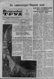 0 -& A —£l u c S^<^^C>TrVX^ ej^ Да здравствует Первое мая! ВРККПСС ИРАЙИСПОЛКОМЕ Пролетарий всея стран, соединяйтесь} 1 CbUU£JcrnU&H£UL Орган Карасукского райкома Коммунистической партии Советского Союза и районного Совета депутатов трудящихся Новосибирской области 1961 1 Мая Понедельник № 53 (2855) ★ Цена 2 коп. Секретарю Карасукского РК КПСС т. ЗАСКОГО Н. И. Председателю райисполкома т. КЛОЧКОВУ В. И. ДОРОГИЕ ТОВАРИЩИ! Коллектив Новосибирского турбогенераторного завода поздравляет вас и всех тружеников сельского хозяйства вашего района с международным праздником Первое мая, Желаем дальнейших успехов в деле подъёма сельского хозяйства и в выполнении решений январского Пленума ЦК КПСС. Директор завода К. ПОТЕХИН Секретарь парткома БУЧНИНСКИЙ Председатель завкома Д. ТИХОНОВ Секретарь комитета ВЛКСМ Г. КОТОВ |(<1:а С праздником, дорогие друзья I ■Р i l l И г P i I Вот и пришел долгожданный Первомай — праздник весны, труда, мира. Радостно отмечают его советские люди, и вместе со всеми— трудящиеся нашего района. Весна нынче необыкновенная Iи не только по погодным условиям, а и по тому трудовому энтузиазму, с каким труженики полей и рабвчие промышленных предприятий пре- Iтворяют в жизнь величественные планы партии на третий [год семилетки, готовя достой- ’ нуто встречу XXII съезду КПСС. По подведенным итогам предмайского соревнования видно, что предприятия промышленности и транспорта успешно справляются с производственными заданиями. Хлеборобы района держат первенство в областном соревновании на весенних полевых работах. Важно не обольщаться этими успехами, не успокаивать, себя достигнутым, а вскрывать неиспользованные возможности и резервы и ставить их на службу производству. В эти дни работники полей несут первомайскую трудовую вахту— закладывают основу для получения высокого урожая. Всех их горячо поздравляем с международным праздником Первое мая и желаем успехов в труде и личной жизни! Верим, что вы приложите все усилия к тому, чтобы вырастить богатый урожай и с честью выполнить высокие обязательства перед государством. первомайским праздником, дорогие друзья! К новым успехам в труде! Итогипредмайского социалистического соревнования по колхозам и совхозам Рассмотрев итоги предмайского соревнования колхозов и совхозов района в области животноводства и весенне-полевых работ, бюро РК КПСС и исполком райсовета признали победителем по производству и продаже продуктов животноводства колхоз «Новая семья» (председатель т. Орлов, секретарь парторганизации т. Му- хамедчин), выполнивший годовой план производства мяса на 14,5 проц., в т. ч. свинины на 20,4 проц., молока— на 18,7 проц. Годовой план поголовья крупного рогатого скота выполнен на 97 проц., в том числе коров на 85 проц. План продажи молока государству за 1-й квартал выполнен на 108 проц., а по сравнению с I-м кварталом 1960 года— на 127 проц., мяса—на 137 проц., или по сравнению с I-м кварталом I960 года больше на 20 проц. План продажи яиц за квартал выполнен на 175 проц. В связи с тем, что колхоз допустил большой отход животных (молодняка), ' знамя РК КПСС и райисполкома ему не присуждено. Среди бригад, отделений и ферм колхозов и совхозов по развитию общественного животноводства, повышению продуктивности и сохранению молодняка всех видов скота первенство завоевала бригада № 4 колхоза «Маяк Ильича» (бригадир т. Юнг). Зде