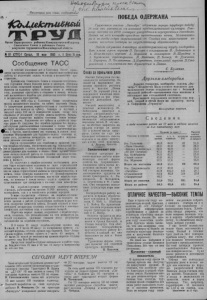 Пролетарии всех стран, соединяйтесь] iCbUueJcrnutHuiii h yr0 б+i S /г^ыли^ /. ФОЫ. л & Л . , ПОБЕДА ОДЕРЖАНА Орган'1»арасукокого райкома Коммунистической тртин Советского Союза и районного Совета депутатов трудящихся Новосибирской области №61 (2711)! Среда, 18 мая I960 г. I Цена 15 коп. Сообщение ТАСС » В теченио последних лет в Советском Союзе проводятся научно-исследовательские и опытно-конструкторские работы по подготовке полета человека в космическое про- ^ странство. Достижения Советского Союзав создании искусственных спутников Земли больших весов и размеров, успешное проведение испытаний мощной ракеты-носителя, способной вывести на заданную орбиту спутник весом в несколько тонн, позволили приступить к созданию и началу испытаний космического корабля для длительных полетов человека в космическом пространстве. 15 мая 1960 года в Советском Союзе осуществлен запуск космического корабля на орбиту спутника Земли. По полученным данным, корабль-спутник в соответствии с расчётом был выведен на орбиту, близкую к круговой, с высотой около 320 км от поверхности земли, после чего отделился от последней ступени ракеты носителя. Начальный период обращения корабля спутника Земли составляет 91 минуту. Наклонение его орбиты к плоскости экватора равно 65 градусам. Вес корабля-спутника без последней ступени ракеты-носителя составляет 4 тонны 540 кг. ^ [ а борту корабля-спутника установлена герметическая ка- Wirna с грузом, имитирующим вес человека, и совсем необходимым оборудованием для будущего полета человека и, кроме того, различная аппаратура, вес которойс источниками питания составляет 1477 кг. Запуск предназначен для отработки и проверки систем корабля-спутника, обеспечивающих ei$ безопасный по- V лет и управление полетом, возвращение на землю и необходимые условия для человека в полете. Этим пуском' положено начало сложной работы по созданию надежных космических кораблей, обеспечивающих безопасный полет человека в космосе. По получении с корабля-спутника необходимых данных будет осуществлено отделение от него герметической кабины весом около 2,5 тонны. Вданном запуске возвращение на землю герметической кабины не предусматривается, и кабина, после проверки надежности её функционирования и отделения от корабля' спутника, как и сам корабль-спутник, по команде с земли начнут спуск и прекратят свое существование при вхождении в плотные слои атмосферы. На корабле-спутнике установлен радиопередатчик «Сигнал», работающий на частоте 19,995 мегагерц, как в телеграфном, так и в телефонном режимах передачи. Пскимо передатчика «Сигнал» на корабле-спутнике размещены специальные радиоустройства для передачи на землю данных о работе установленных приборови для точного измерения элементов орбиты. Инганпе научной и измерительной аппаратуры спутника осуществляется с помощью химических источников тока и солнечных батарей. Обработка первых данных, полученных с корабля-спутника, показала, что установленная на нем аппаратура работает нормально, наземные станции ведут регулярные наблюдения за кораблем-спутником. В 6 часов 11 минут корабль-спутник прошел над Москвой. В 7 часов 38 минут по московскому времени советский корабль- спутник нрошел над Парижем. Над'Ленинградом корйбль спутник прошел в 7 часов 43 минуты. В 10 часов 35 минут по московскому времени корабль-спутник пролетел 