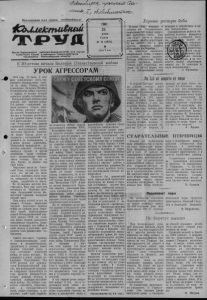 ( jr O L ' u^cu<£k/ J7J crisSuSiuM bfesees^ Пролетарии всех стран, соединяйтесь! ^йкиектылЯншi Орган Карасукского райкома Коммунистичес ксй партии щ Советского Союза и районного Совета депутатов “ трудящихся Новосибирской области 1961 2 1 июня Среда № 74 (2876) ★ Цена 2 коп. У К 20-летию начала Великой Отечественной войны УРОК АГРЕССОРАМ 1941 год, 22 июня. В этот день вооруженные силы германского империализма напали на нашу Родину, светоч социализма. Началась Великая Отечественная война советского нарбда, от исхода которой зависели судьбы человечества. Международный империализм породил две мировые войны. Его детище — германский фашизм развязал вторую мировую бойню, унесшую миллионы жизней. Монополисты США, Англии и Франции расчитывали удушить первое в мире рабоче-крестьянское ' Государство-Советский Союз руками германской военщины, разгромить международное освободительное движение. Правители стран Запада долго заигрывали с гитлеровской Германией и ее сообщниками, и в конце концов доигрались. Германский империализм, домогаясь мирового господства, повернул оружие и против вчерашних своих сообщников— организаторов мюнхенского сговора. Чуть ли не всю Европу оп подмял иод свой сапог. Вероломно напав на Советский Союз, гитлеровцы полагали, что им так же легко удастся завоевать нашу страну, превратить ее в свою колонию, поработить ее народ. Но гитлеровцы жестоко просчитались. Весь мир знает,чем кончилась их безумная авантюра. Людоедские планы фашистской Германии потерпели полный крах. Наш народ стеной встал на защиту Отчизны. Временные неудачи начального периода войны не сломили духа советских людей. Вдохновляемые родной Коммунистической партией, народы СССР, их славные воины сумели . преодолеть неимоверные трудности, решительно повернуть ход войны в свою пользу и наголову разгромить блок фашистских государств. Такого массового героизма и самопожертвования, стойкости и организованности, дисциплины и умения, какие проявил советский народ в огне тягчайших испытаний войны, не знала история. Не померкнет в веках нодвпг доблестных 'Вооруженных Сил СССР, которые под руководством Коммунистической партии, при всенародной поддержке сокрушили сильнейшую по тому времени империалистическую военную машину и одержали всемирно-историческую победу. Эта победа— торжество советского общественного и государственного строя, самых гуманных и передовых идей—идей марксизма-ленинизма, победа мудрой, дальновидной политики КПСС. Фальсификаторам истории не удастся умалить значения великого ратного подвига советского народа и его армии. Ведь не где-нибудь, а именно на советско-германском фронте был достигнут коренной перелом в ходе второй мировой войны, здесь решались судьбы народов, мировой цивилизации. Советский народ вынес на своих плечах основную тяжесть войпы, ему принадлежит решающая роль в разгроме фашистских орд. Советская Армия не только отстояла страну социализма, но и избавила народы мира от страшной угрозы фашистской тирании. Вступление СССР в войну против фашистской Германии явилось решающим фактором превращения ее в освободительную войну народов против фашизма. Советская держава стала ведущей силой антифашистской коалиции. Мы не забываем заслуг других народов и государств—участников антигитлеровской коалиции. Большой вклад в дело разгр