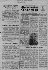 е&е. ИНФОРМАЦИОННОЕ СООБЩЕНИЕ id Пленуме Центрального Комитета Коммунистической партии Советского Союза 19 июня 1961 года состоялся Пленум Центрального Комитета Коммунистической партии' Советского Союза. Пленум ЦК КПСС заслушал и обсудил доклад Первого секретаря ЦК КПСС товарища Хрущева Н. С. „О проекте Программы КПСС" и доклад секретаря ЦК КПСС товарища Козлова Ф .Р .„0 проекте Устава КПСС". В работе Пленума приняли участие члены ЦК КПСС, кандидаты в члены ЦК КПСС, первые секретари ЦК компартий союзных республик, крайкомов и обкомов партии, ответственные работники ЦК КПСС и союзных органов. Пленум принял соответствующие постановления, которые сегодня публикуются. ОПРОЕКТЕ ПРОГРАММЫКПСС Постановление Пленума ЦК КПСС по докладу тов. Хрущева Н. С.} принятое 19 июня 1961 года Заслушав и обсудив доклад Первого секретаря ЦК КПСС тов. Хрущева Н. С. „О проекте Программы КПСС", Пленум ЦК КПСС единодушно одобряет представленный программной комиссией и рассмотренный Президиумом ЦК КПСС проект Программы Коммунистической партии Советского Союза. Опубликовать проект Программы КПСС в печати 30 июля 1961 года для всеобщего ознакомления и обсуждения членами и кандидатами в члены КПСС и всеми трудящимися. Обязать ЦК компартий союзных республик, обкомы, крайкомы, горкомы и райкомы партии организовать широкое обсуждение проекта Программы КПСС в первичных партийных организациях.на районных, городских, областных, краевых конференциях и съездах компартий союзных республик. О ПРОЕКТЕ УСТАВА КПСС Постановление Пленума ЦК КПСС по докладу тов. Козлова Ф. P.t принятое 19 июня 1961 года Заслушав и обсудив доклад секретаря ЦК КПСС тов. Козлова Ф. Р. „О проекте Устава КПСС", Пленум ЦК КПСС постановляет: 1. Одобрить в основном проект Устава КПСС, представленный Президиумом ЦК КПСС на рассмотрение Пленума ЦК КПСС. 2. Опубликовать проект Устава КПСС в печати 20 августа 1961 года для всеобщего ознакомления д обсуждения членами и кандидатами в члены КПСС и всеми трудящимися СССР. 3. Обязать ЦК компартий союзных республик, обкомы, крайкомы, горкомы и райкомы партии организовать широкое обсуждение проекта Устава КПСС во всех первичных партийных организациях, на районных, городских, областных, краевых конференциях и съездах компартий союзных республик. Сенокос начался На 8 отделении Хорошин- ского совхоза создано механизированное звено по заготовке кормов. Возглавляет его коммунист Вл. Овчаров. В распоряжении звена 3 прицепных, навесная и две конных сенокосилки, двое тракторных граблей, толкающая волокуша, сеноподборщик, переоборудованный из-под комбайна, и 3 прицепные волокуш. 22 июня агрегат из 3 сенокосилок вышел на луга и за неполный день скосил гривные травы с 15 гектаров. На косилках—комсомольцы М.Клочков, А.Великородный, В. Худолеев. Сегодня на подборку сена вышли грабли. Скоро будет пущена остальная техника. Пролетарии всех стран, соединяйтесь! 4£Ъииек*пи&шй Орган Карасукского райкома Комм унистической партии Советского Союза и районного Совета депутатов трудящихся Новосибирской области М11Ш1ШШ111ШП1ШШ11ПШП1 1961 25 июня Пятница Ж 75 (2 8 7 7 ) ★ Цена 2 коп. v: 1 в у Корма будут В прошлые годы ремонт посевного сельхозинвентаря мы обычно откладывали на зиму и даже весну. Нынче же механизаторы справились4 с этой задачей сразу посде. посевной. Отремонтированы сеялки, сцепки и другой 