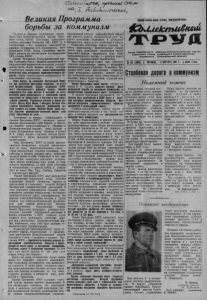 2 КОЛЛЕКТИВНЫЙ ТРУД 4 августа 1961 года, М 93 Великая Программа борьбы за коммунизм (Окончание. Нач. на 1-й стр.) громлюбого врага, который осмелится посягВ проекте Программы КПСС формулируют- нуть на Сове т с кую Роди ну, ся задали партии в области государствен- Советский народ строит коммунизм под ного строительства идальнейшего развития испытанным руководством Коммунистической социалистической демократии. партии, ее ленинского Центрального Комитета Ленин, партия в острой борьбе против воглаве с товарищем Н. С. Хрущевым. В оппортунистов отстояли и развили идею дик- проекте сформулирован важнейший вывод о татуры пролетариата. Наша партия пер- том, что в результате победы социализма, ук- вая в истории добилась установления дикта- репления единства советского общества Ком- туры пролетариата, что явилось решаю- мунистическая партия рабочего класса преврати- щим условием создания нового общества, лась в авангард советского народа, стала партией великого взлета страны от былой отсталости всего народа, расширила свое направляющее к вершинам социального прогресса. влияние на все стороны общественной жизни «Обеспечив полную и окончательную по- Период развернутого строительства комму беду социализма—первой фазы коммунизма,— низма характеризуется дальнейшим возраста и переход общества к развернутому строи- нием роли и значения Коммунистической пар- тельству коммунизма,—указывается в проек- тии, как руководящей и направляющей силы те Программы,—диктатура пролетариата вы- советского общества. полнила свою историческую миссию и с точ- В непоколебимой верности учению Марк ки зрения задач внутреннего развития пере- са—Энгельса—Ленина заключается важней- стала быть необходимой в СССР. Государ- шийисточник великой роли партии как зод- ство, которое возникло как государство дик- чего коммунизма. КПСС—партия творческого татуры пролетариата, превратилось в общена- марксизма-ленинизма, общепризнанный знаме- родное государство, в орган выражения инте- носец самых передовых идей нашего времени, ресов и воли всего народа». идей марксизма-ленинизма. В неразрывно! Партия в проекте своей Программы наме- связи с жизнью она развивает революционную чает широкую систему мерв области идеоло- теорию, освещая путь практике. Идяв аван- гии, воспитания, образования, науки и куль- гарде интернациональной борьбы, ленинская туры. Главное в идеологической работе на партия первой всесторонне разработала боль- современном этапе—воспитание всех тру- шиои сложные проблемы социалистической дящихся в духе высокой идейности и предан- революции и социалистического строительства ности коммунизму, коммунистического от- Теперь она совершила новыйвыдающийся на ношения к труду и общественному хозяйству, учный подвиг, всесторонне разработав проб полное преодоление пережитков буржуазных лемы перехода от социализма к коммунизму взглядов и нравов, всестороннее, гармониче- Важную роль в творческом развитии маркой свое развитие личности, создание подлинного стско-ленинской теории, в практике коммуни богатства духовной культуры. Особое значе- стического строительства сыграли XX и ние партия придает воспитаниюподрастающего XXI съезды КПСС. поколения. В проекте Программы КПСС ука- ^Закон жизни партии— неукоснительное зываются пути и средства воспитания комм